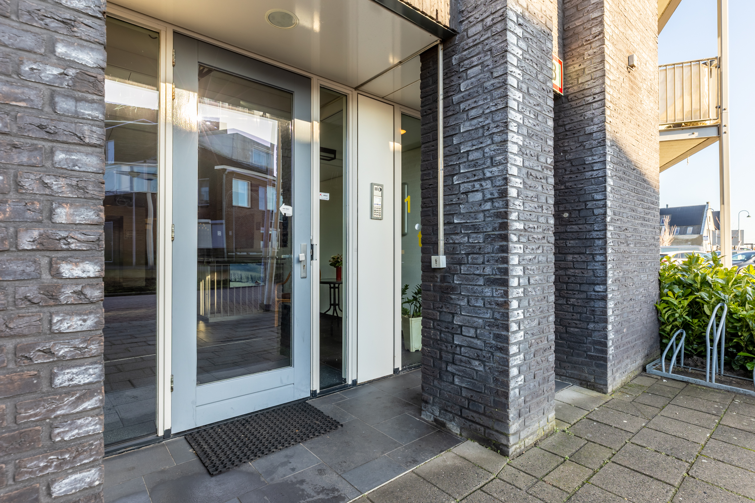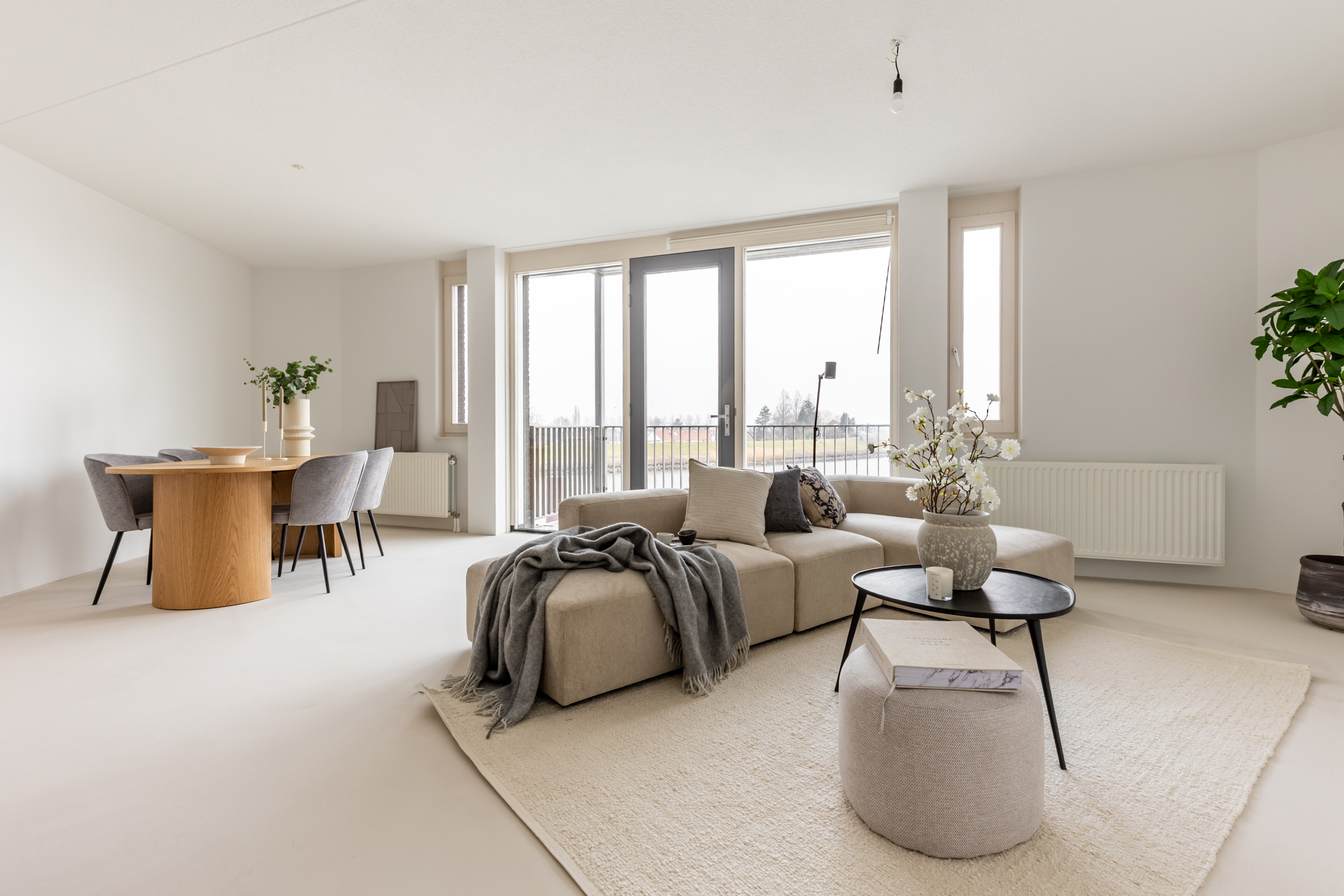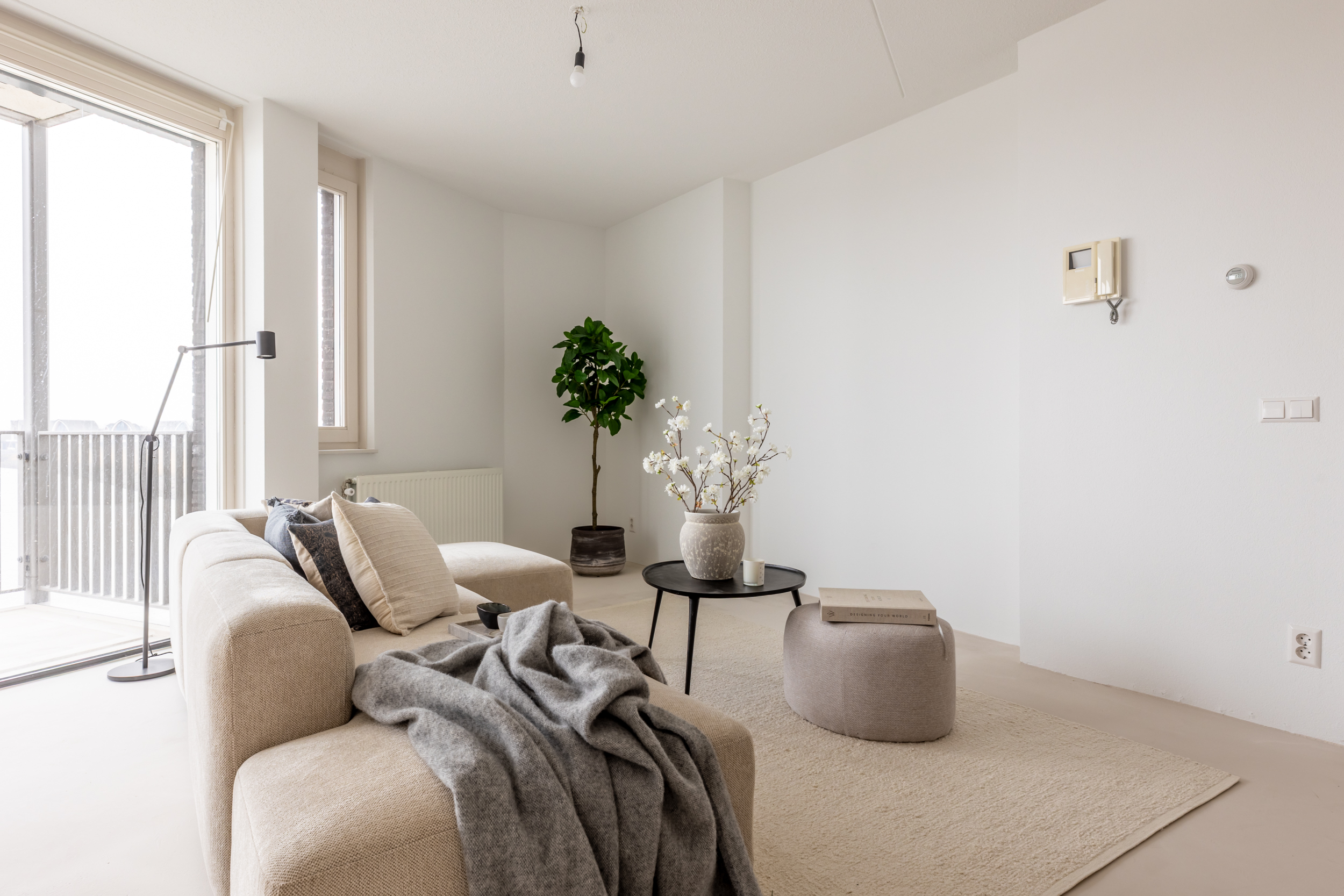 Ruime overloop, woningentree, hal met meterkast, interne bergruimte met cv-opstelling en met wasmachineaansluiting, separaat toilet met duoblok en fonteintje, badkamer met douchecabine en wastafelmeubel, twee slaapkamers én een ruime, lichte woonkamer met open keuken. Vanuit de woonkamer is het overdekte balkon bereikbaar, waar u heerlijk kunt genieten van het uitzicht.