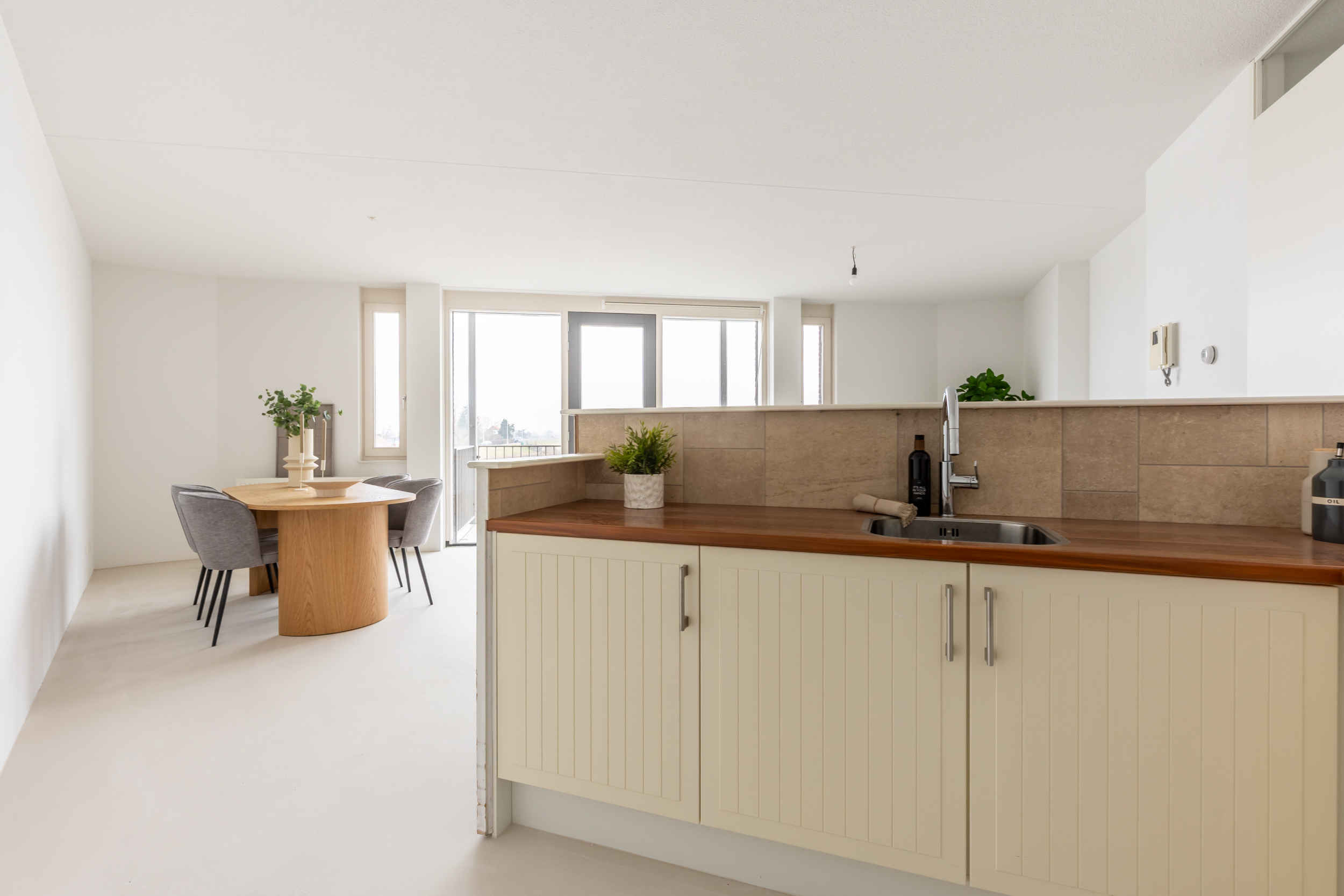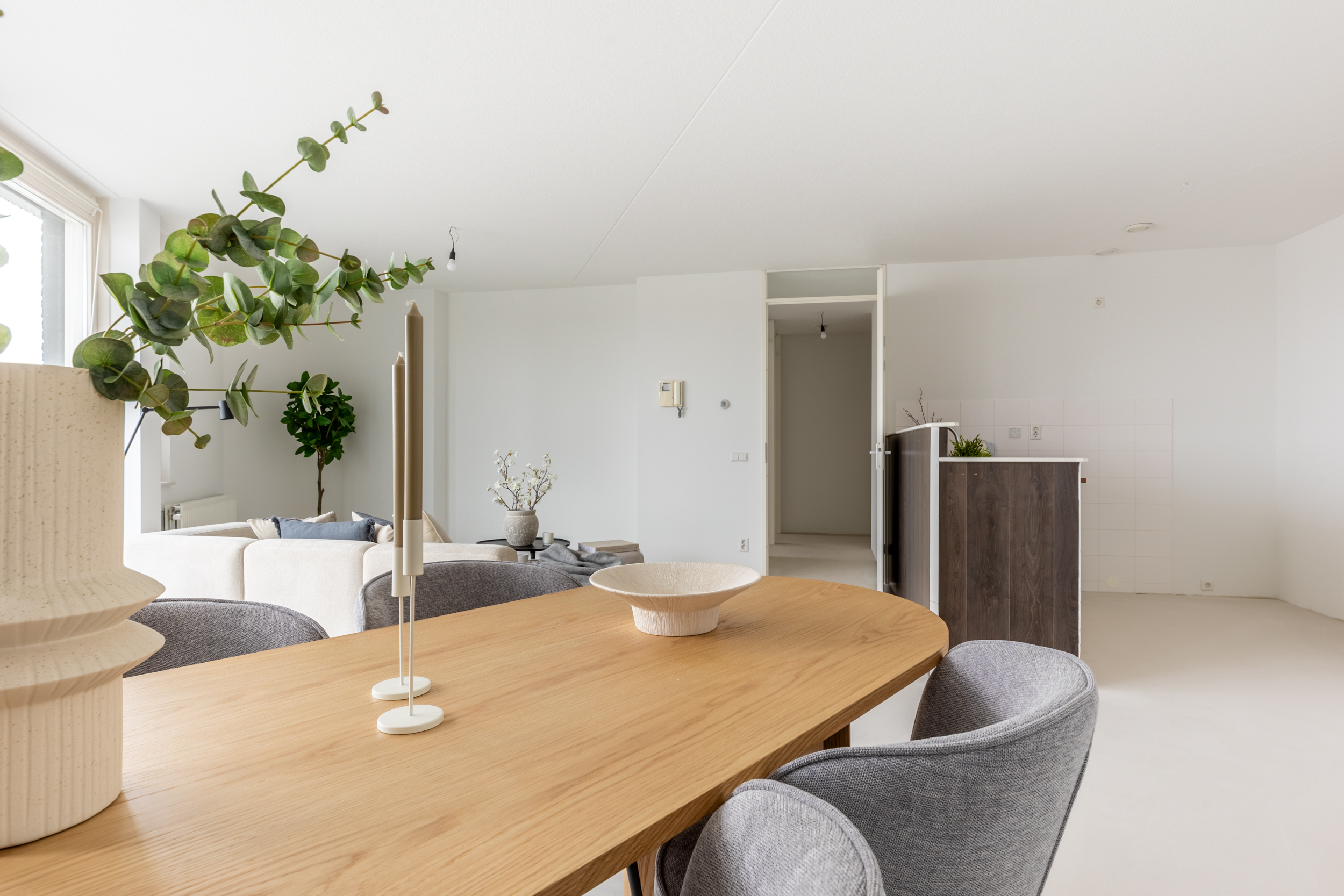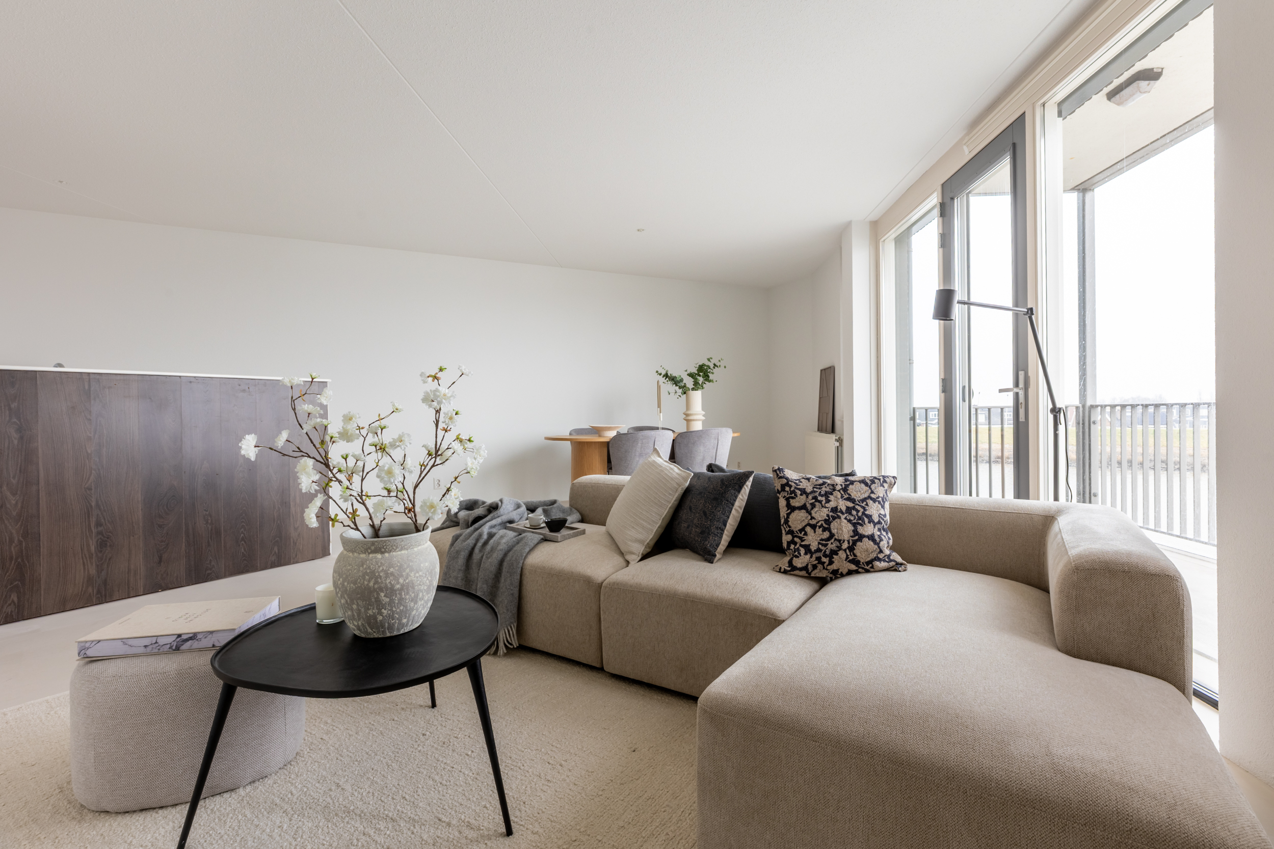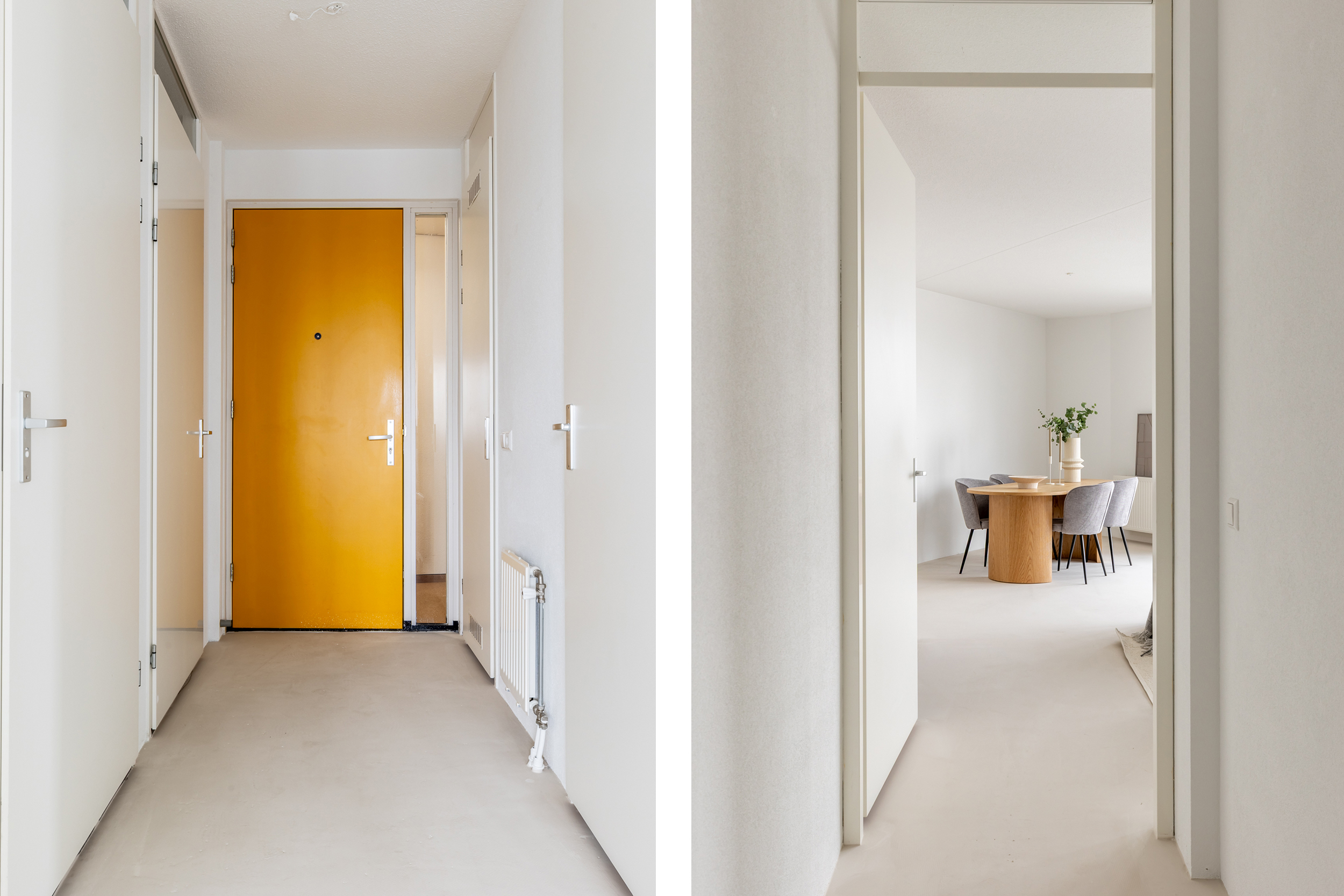 Ruime overloop, woningentree, hal met meterkast, interne bergruimte met cv-opstelling en met wasmachineaansluiting, separaat toilet met duoblok en fonteintje, badkamer met douchecabine en wastafelmeubel, twee slaapkamers én een ruime, lichte woonkamer met open keuken. Vanuit de woonkamer is het overdekte balkon bereikbaar, waar u heerlijk kunt genieten van het uitzicht.