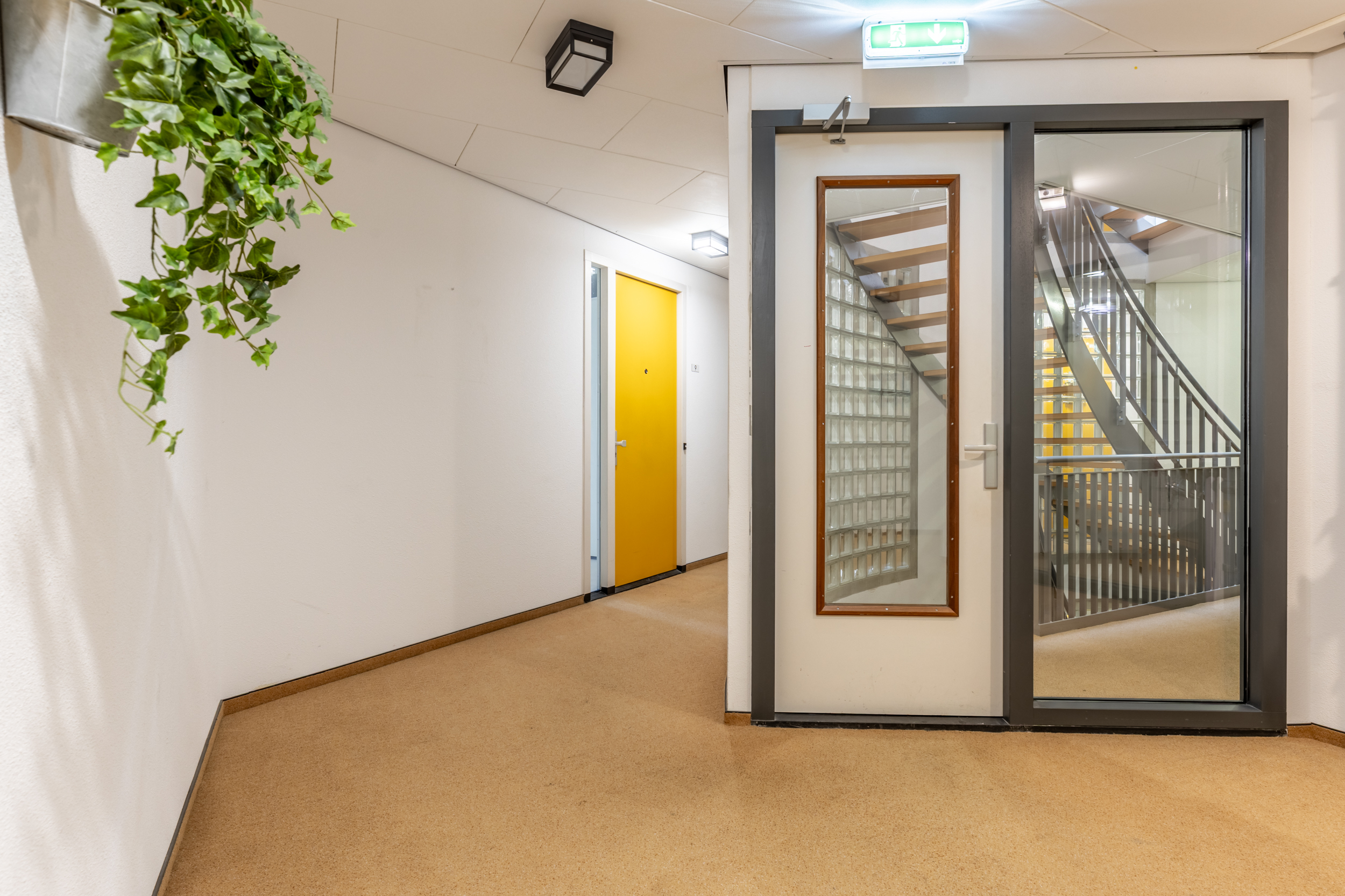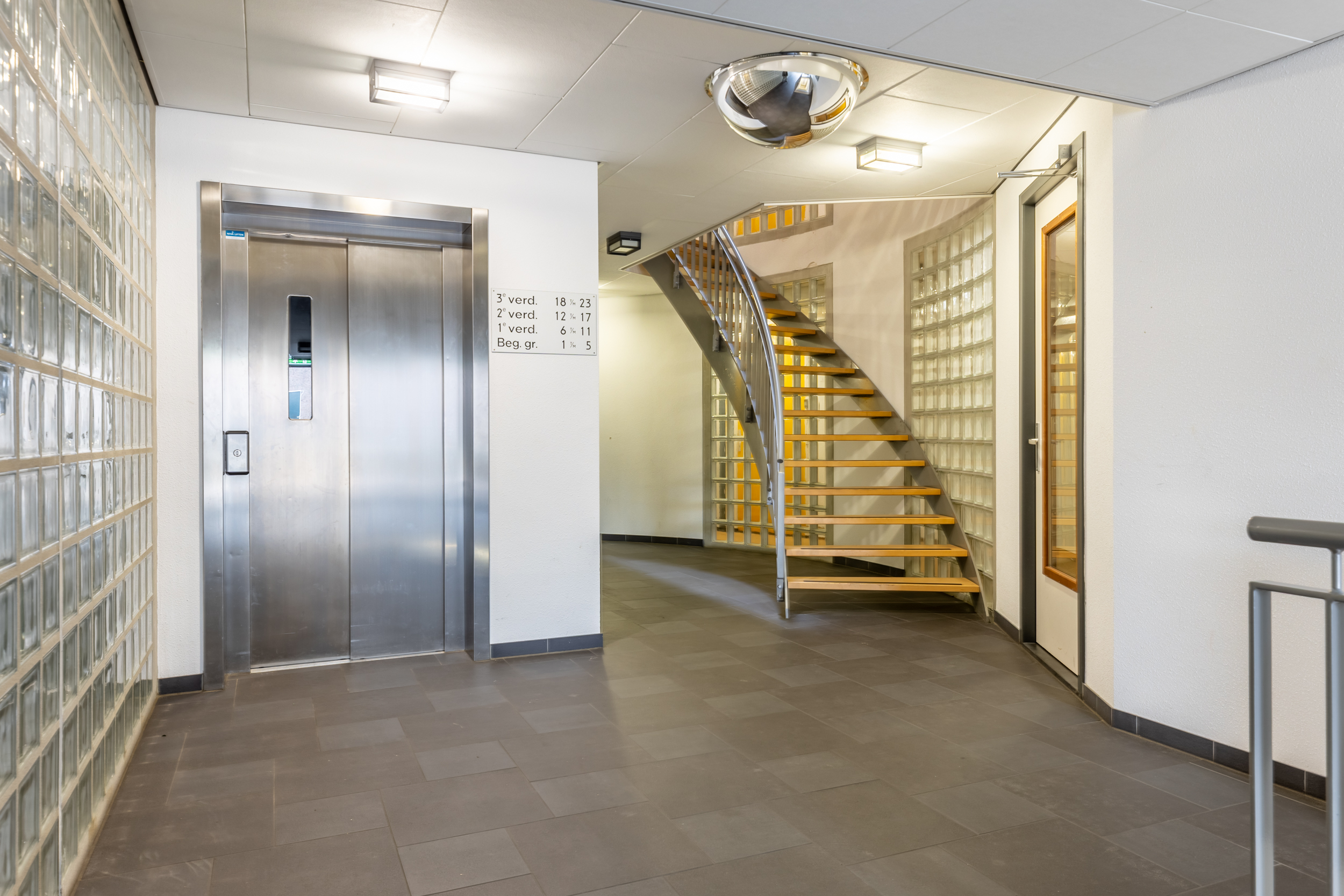 Begane grond: Afgesloten gemeenschappelijke entree met bellenplateau, hal met toegang tot de gemeenschappelijk fietsenstalling, lift en trappenhuis.