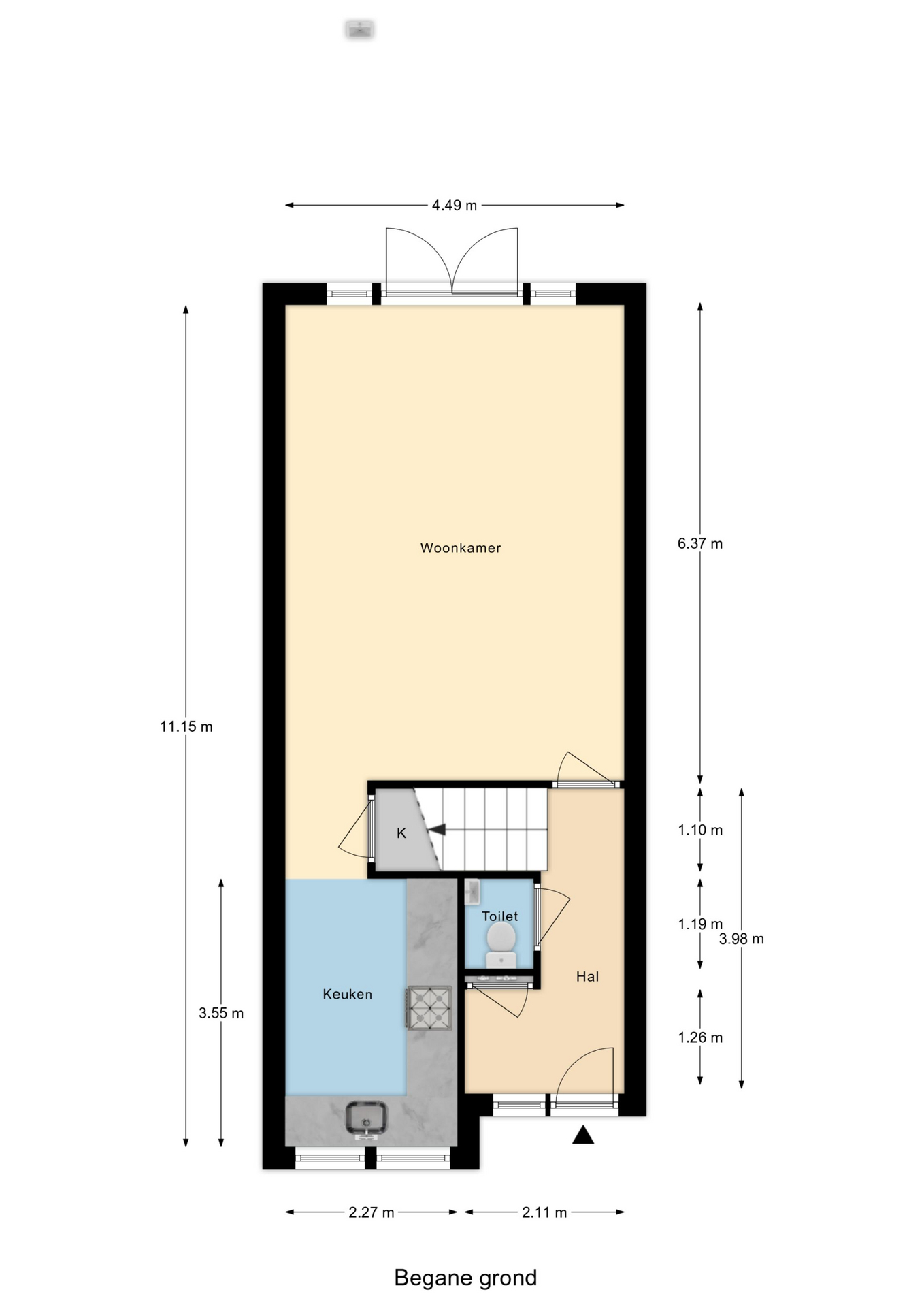 Voortuin, woningentree, hal met trap naar de eerste verdieping, de meterkast, het toilet met hangend closet en fonteintje en toegang tot de woonkamer aan de achterzijde van de woning met trapkast, de halfopen keuken en een openslaande deuren naar de achtertuin, gelegen op het Oosten met een houten berging en een achterom. Op de eerste verdieping komt men via de overloop met trap naar de tweede verdieping in de badkamer met buitenraam én de twee slaapkamers, waarvan de achterslaapkamer met deur naar het dakterras. Op de tweede verdieping komt men in via de overloop in eveneens twee slaapkamers en een multifunctionele ruimte met opstelling voor de wasmachine en droger.