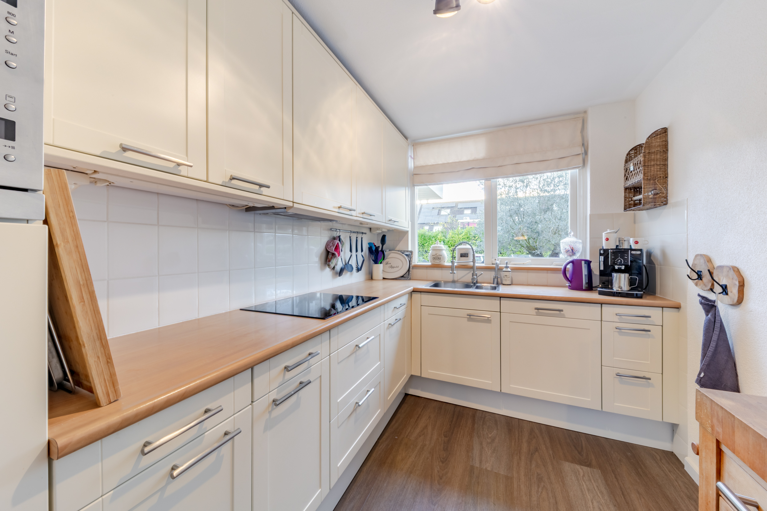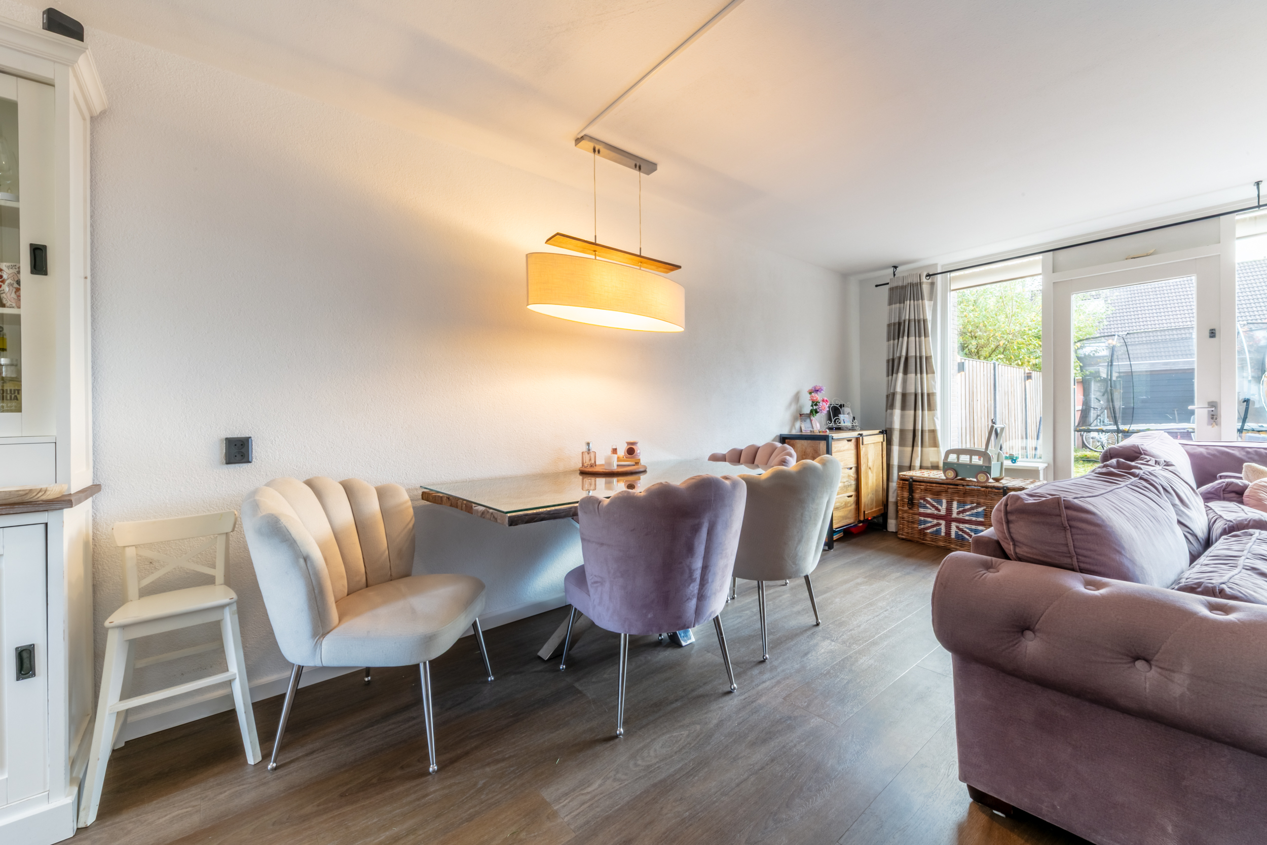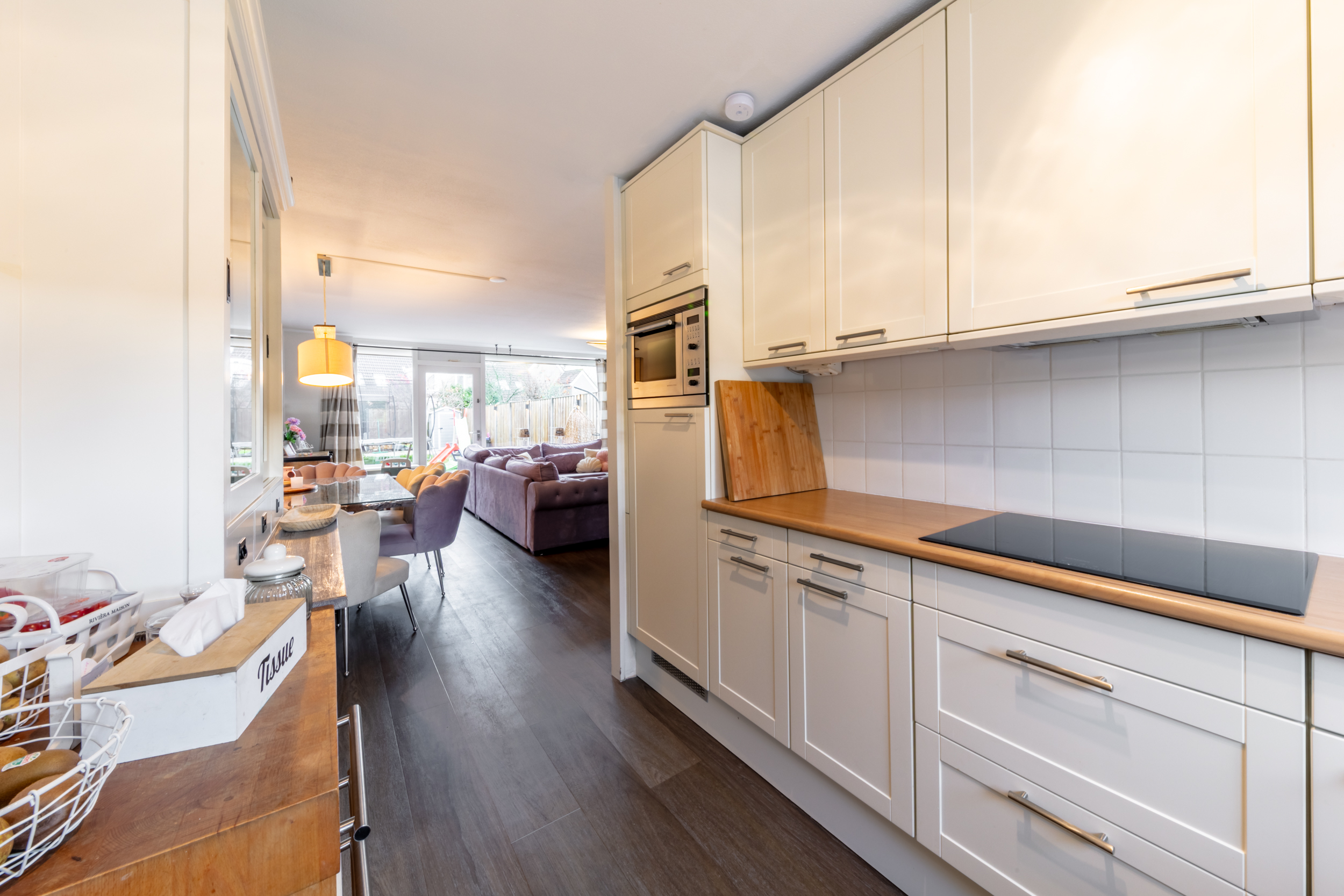Achter de zithoek is ruimte gecreëerd voor de eettafel met uitzicht op de tuin. Aan de voorzijde van de woning bevindt zich de keuken, opgesteld in een praktische L-vorm die doorloopt onder het raam. De keuken is uitgerust met diverse inbouwapparatuur, waaronder een koelkast, inductiekookplaat, een hooggeplaatste combioven, afzuigkap en vaatwasser.