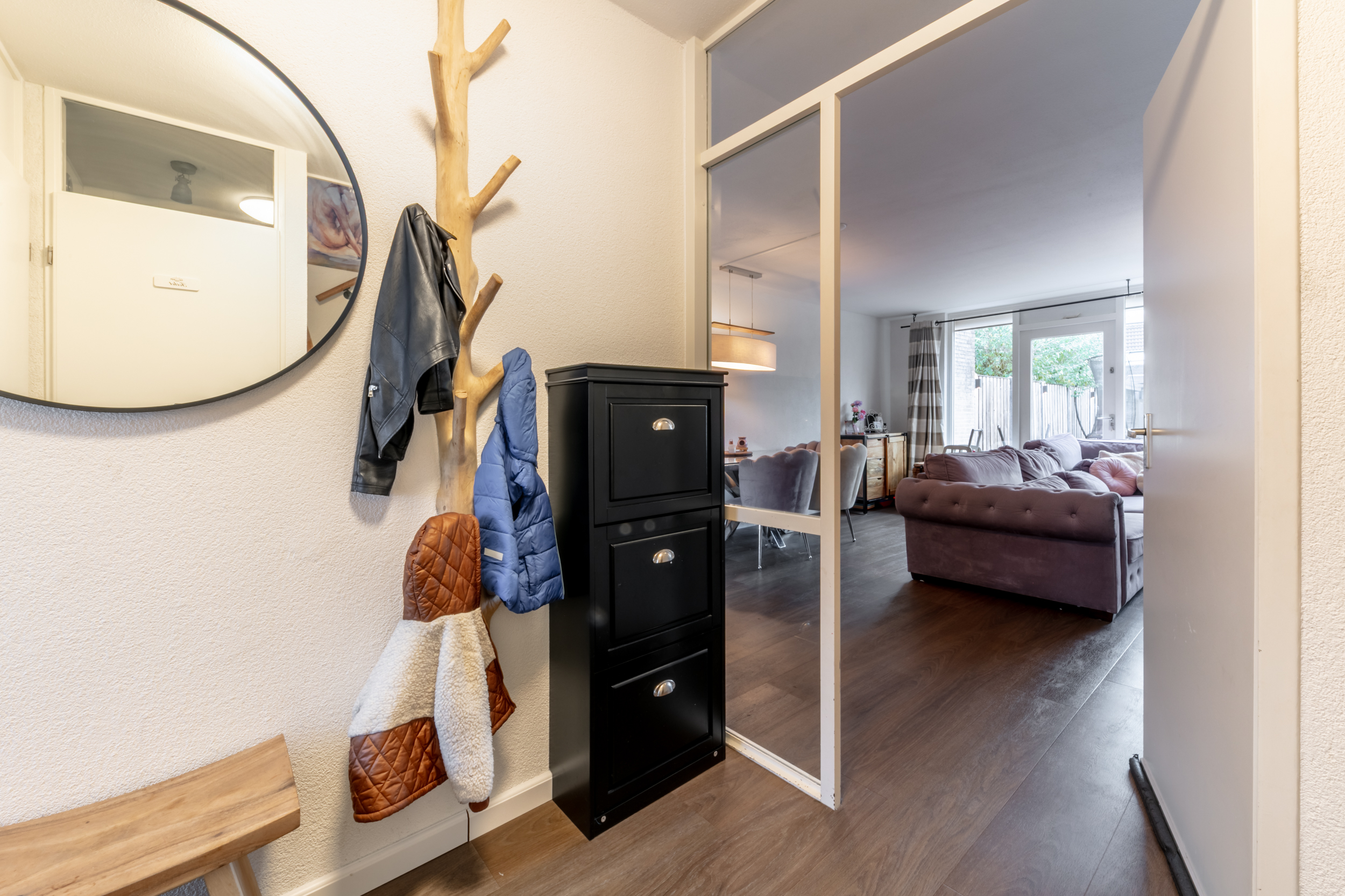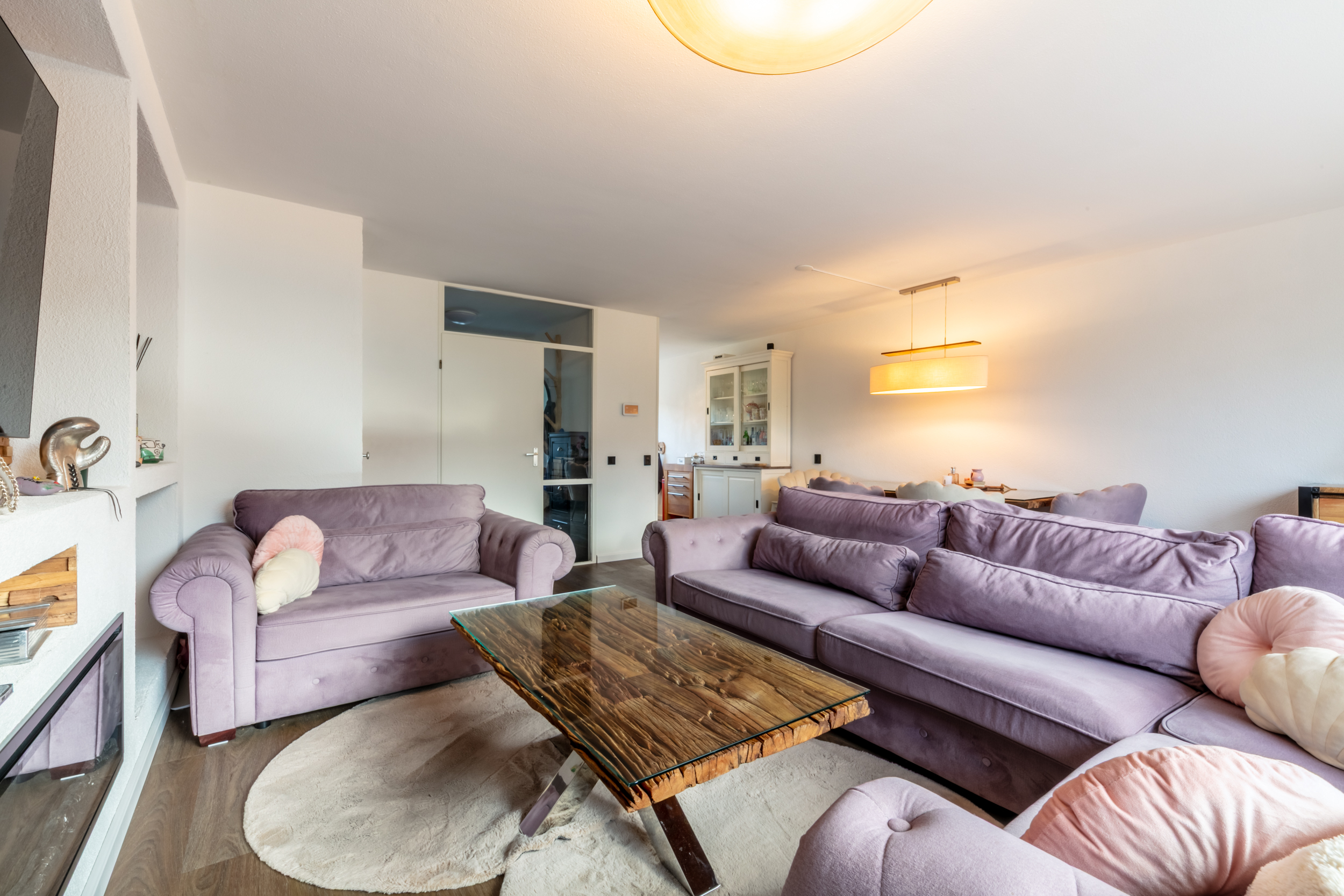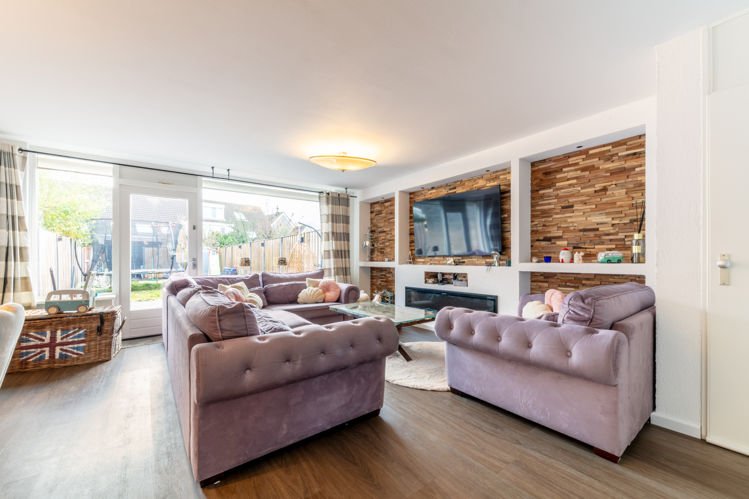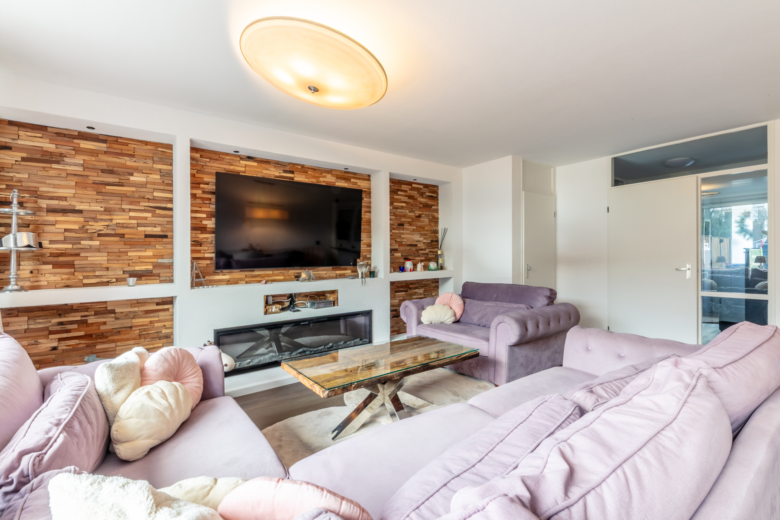 De glazen pui tussen de hal en de woonkamer zorgt voor een prettige lichtinval en een open gevoel. Zodra u de woonkamer binnenkomt, kijkt u prachtig uit op de gezellige zithoek en de diepe, zonnige achtertuin. De zithoek is sfeervol gecentreerd rondom de ingebouwde elektrische open haard.