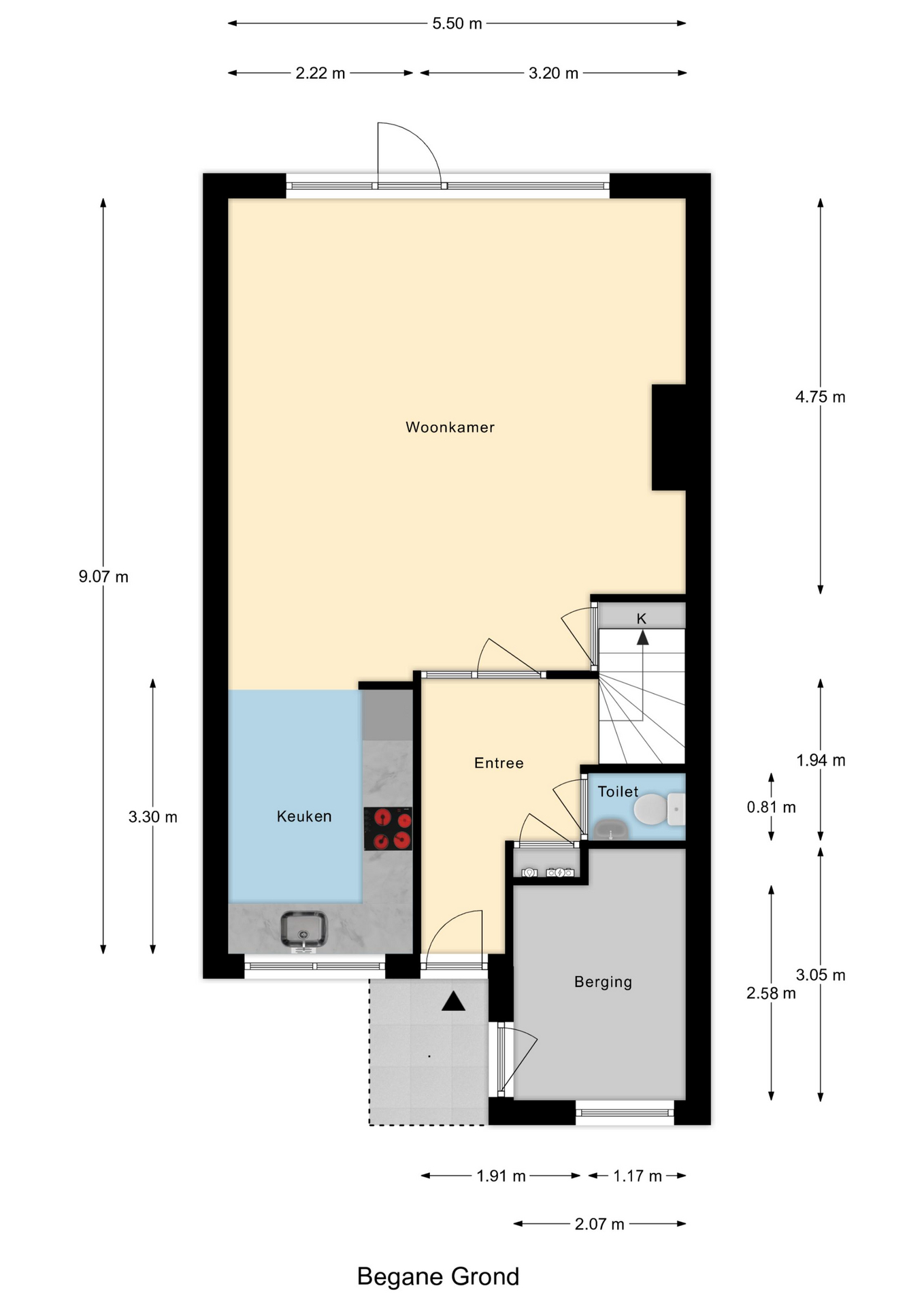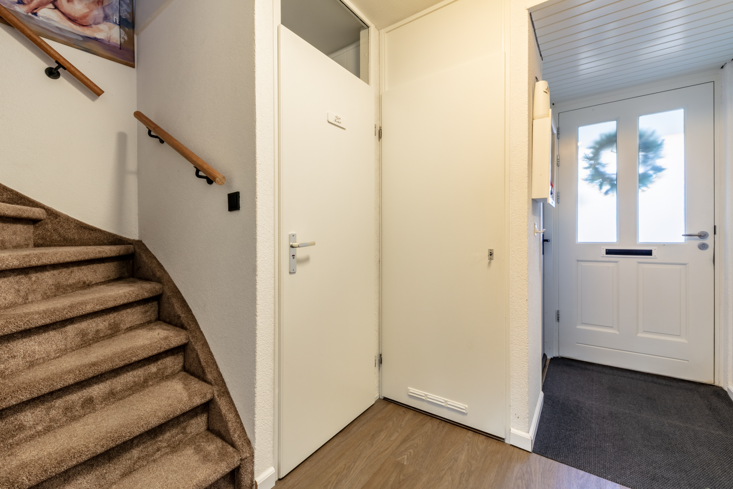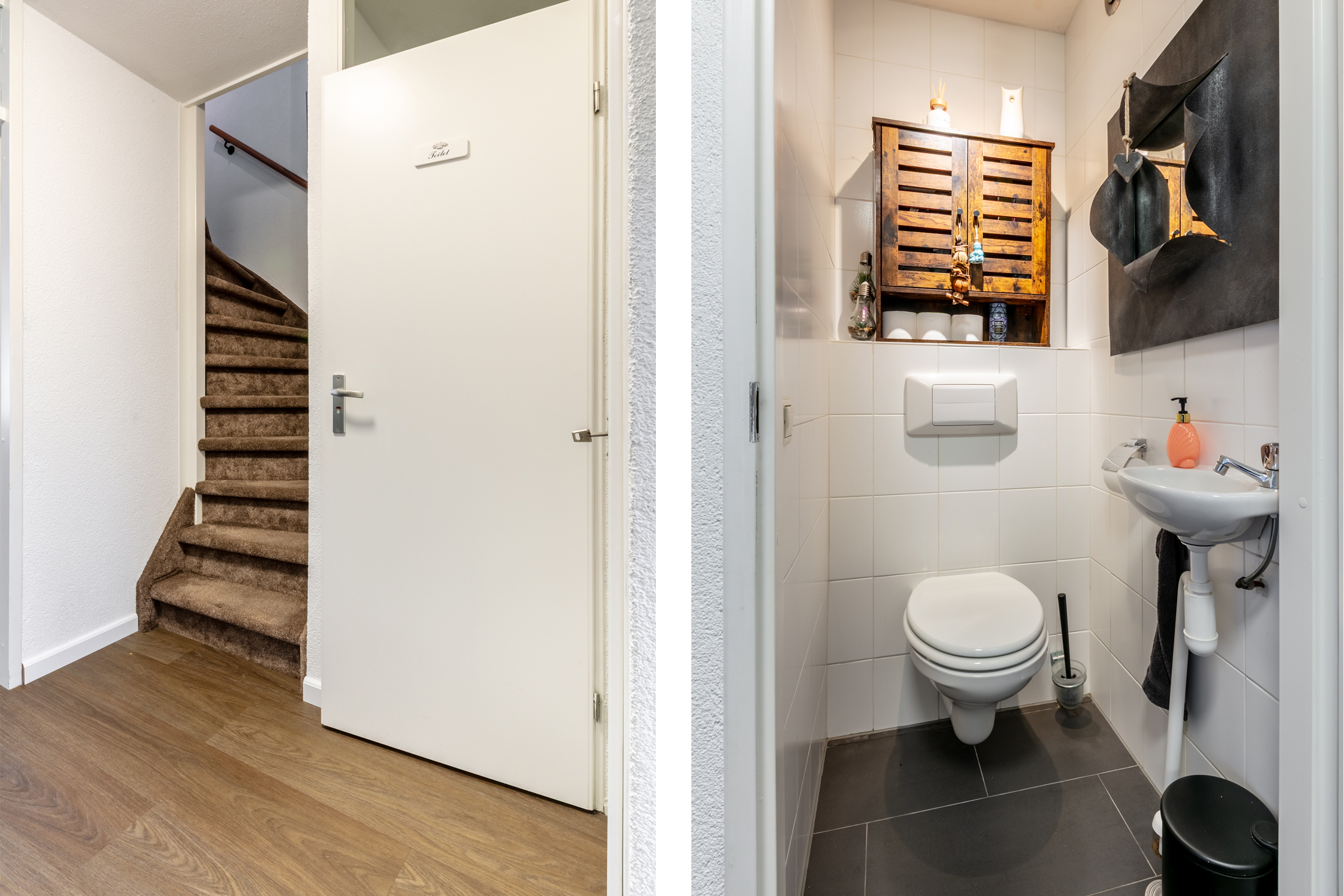 Wanneer u de woning binnenstapt, komt u terecht in een ruime en lichte hal. Rechts vindt u de deur naar de berging, die tevens beschikt over een eigen buitendeur. Ideaal voor het opslaan van voorraden of voor het stallen van natte jassen en schoenen. In de hal bevindt zich ook het volledig betegelde toilet met hangend closet en een compact fonteintje.