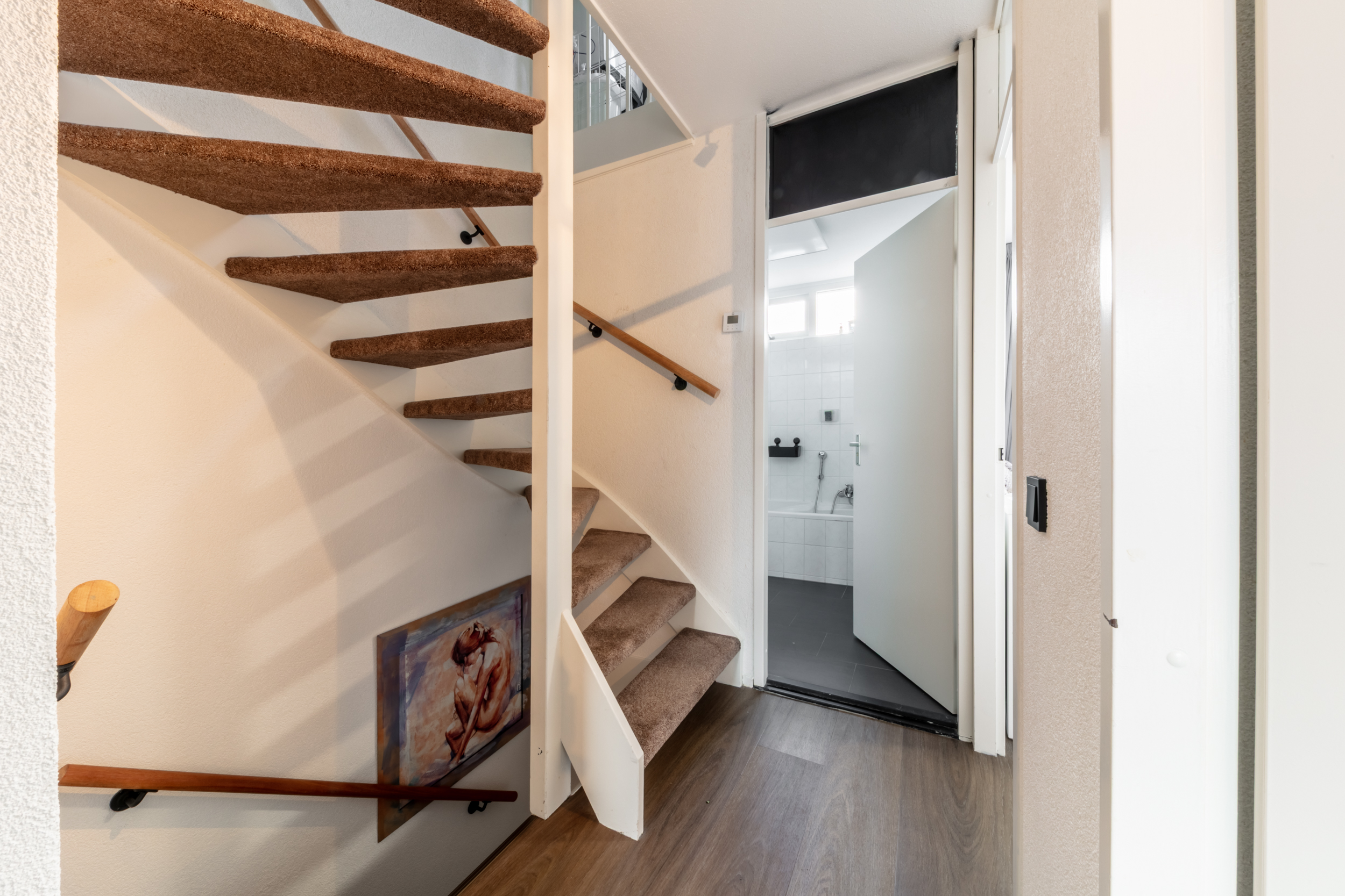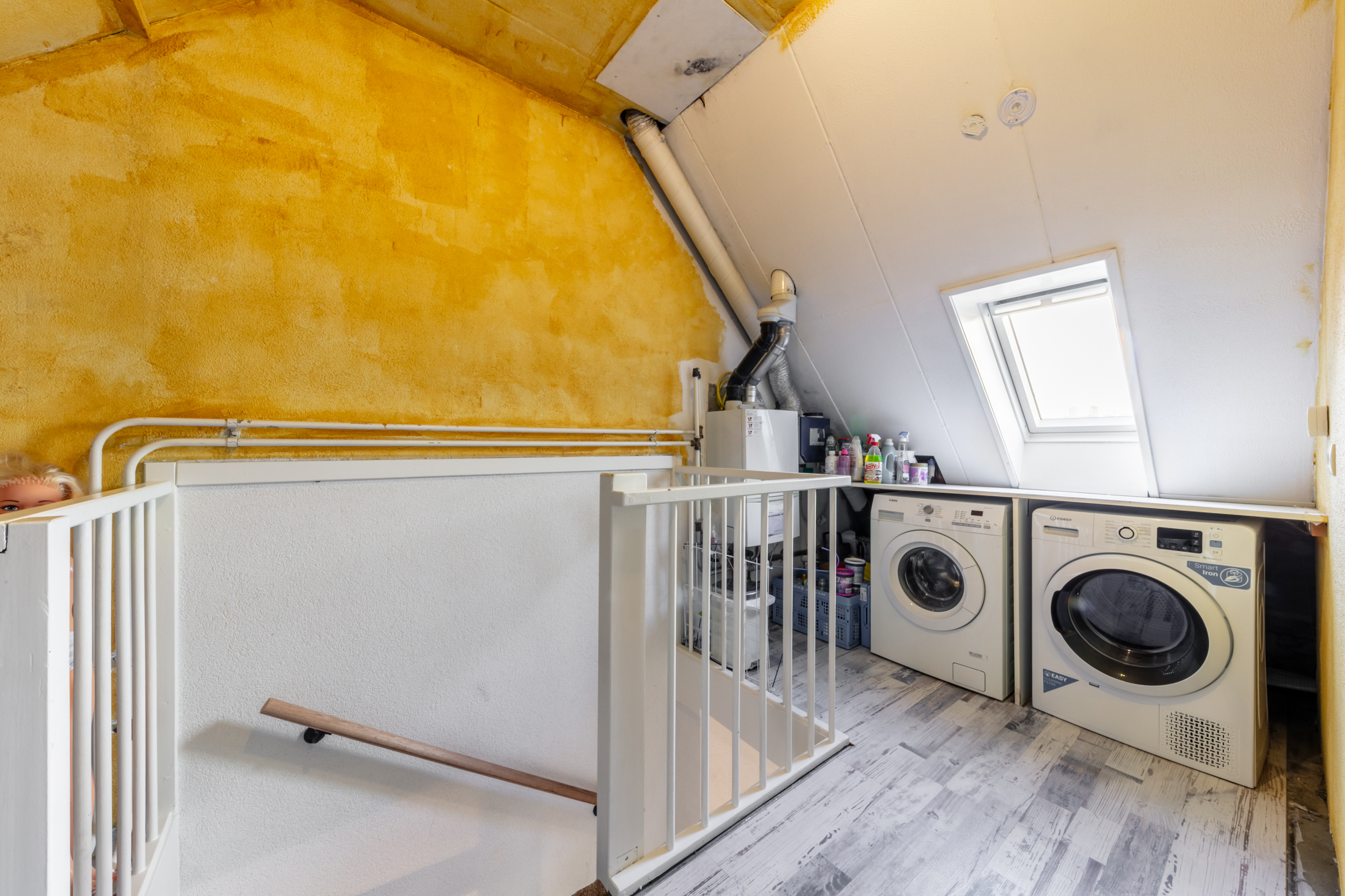 De tweede verdieping biedt een riante voorzolder met aan de voorzijde de wasmachineaansluiting en een dakraam voor daglicht en ventilatie. Aan de andere zijde is extra bergruimte aanwezig, ideaal voor het opbergen van seizoensspullen.