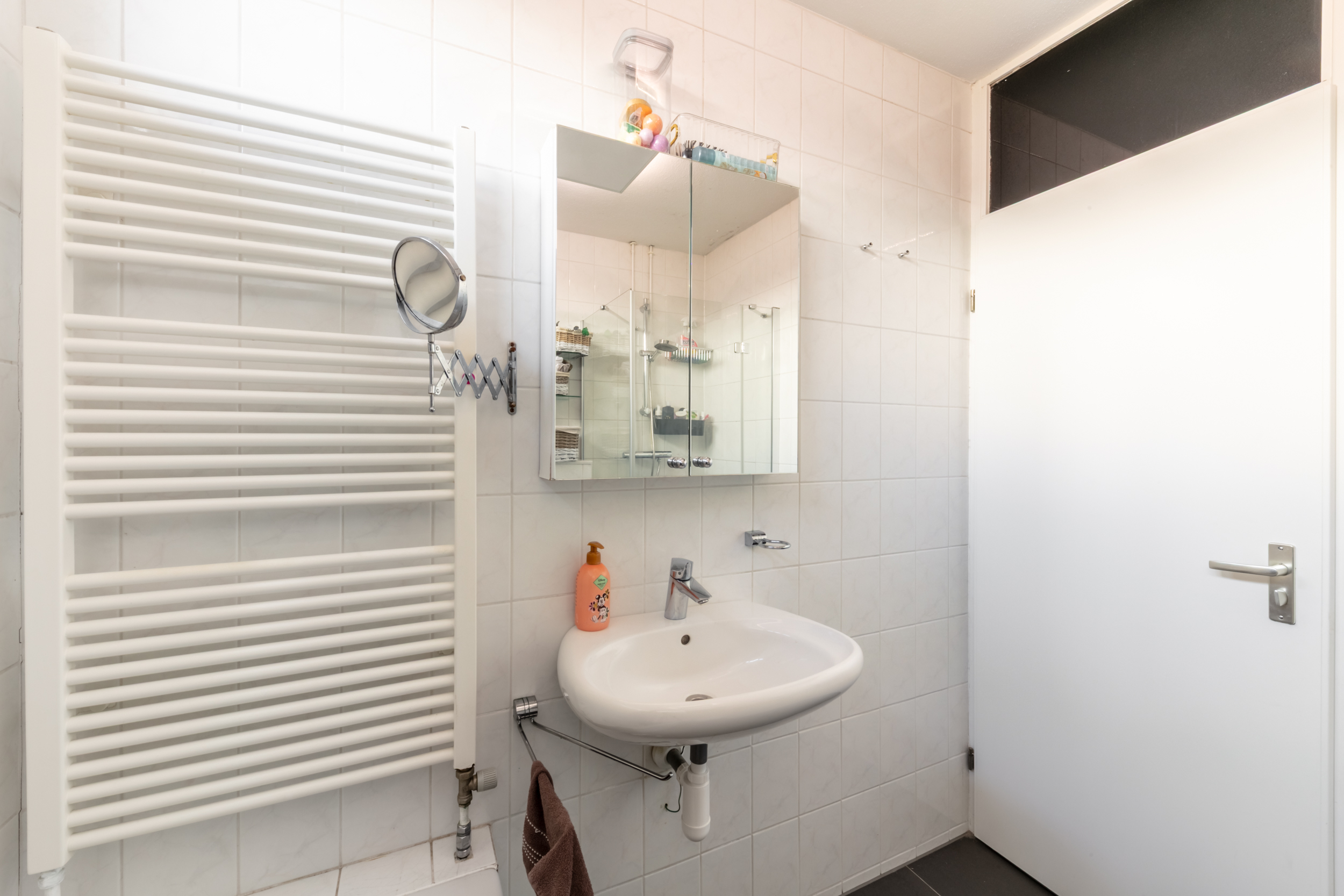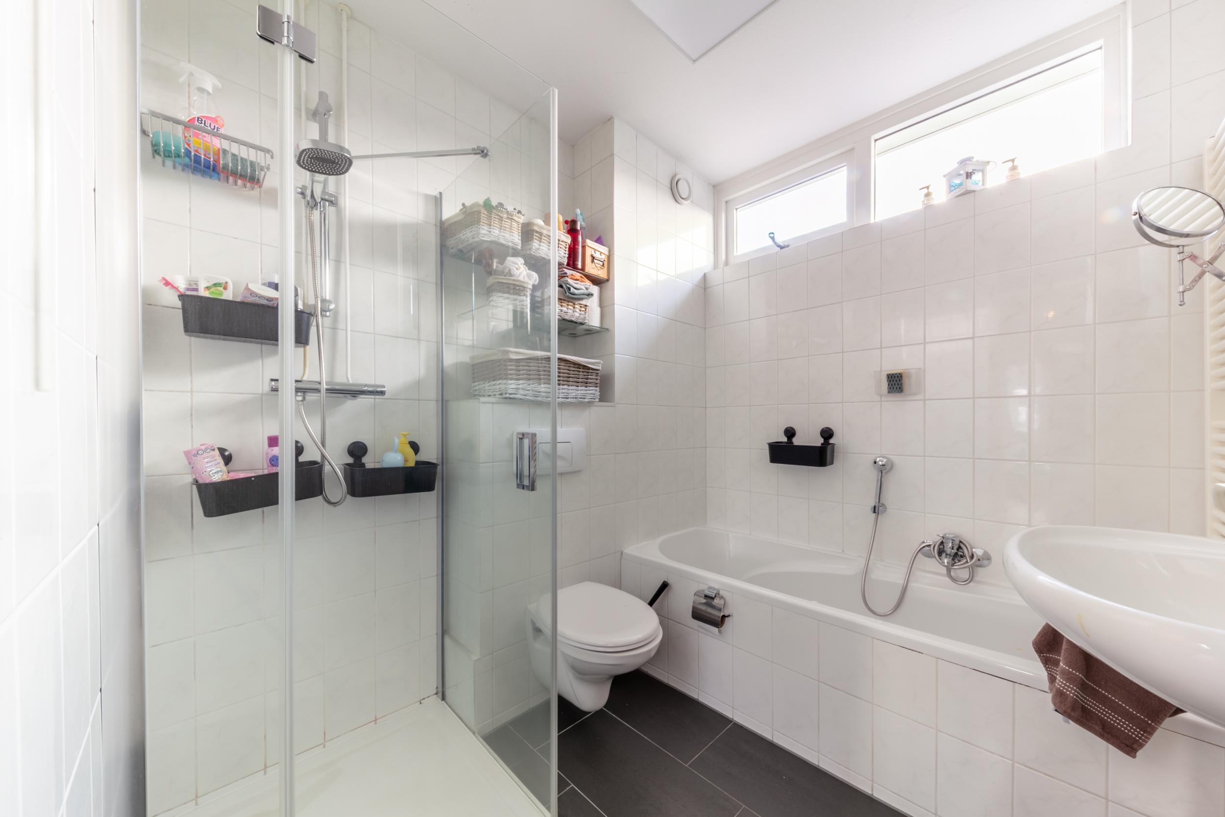 Naast deze slaapkamer bevindt zich de badkamer. Deze is volledig betegeld in dezelfde stijl als het toilet beneden en beschikt over een ligbad, douche, tweede toilet en wastafel. Dankzij de twee ramen, waarvan één te openen is, geniet u hier van natuurlijke ventilatie en daglicht.