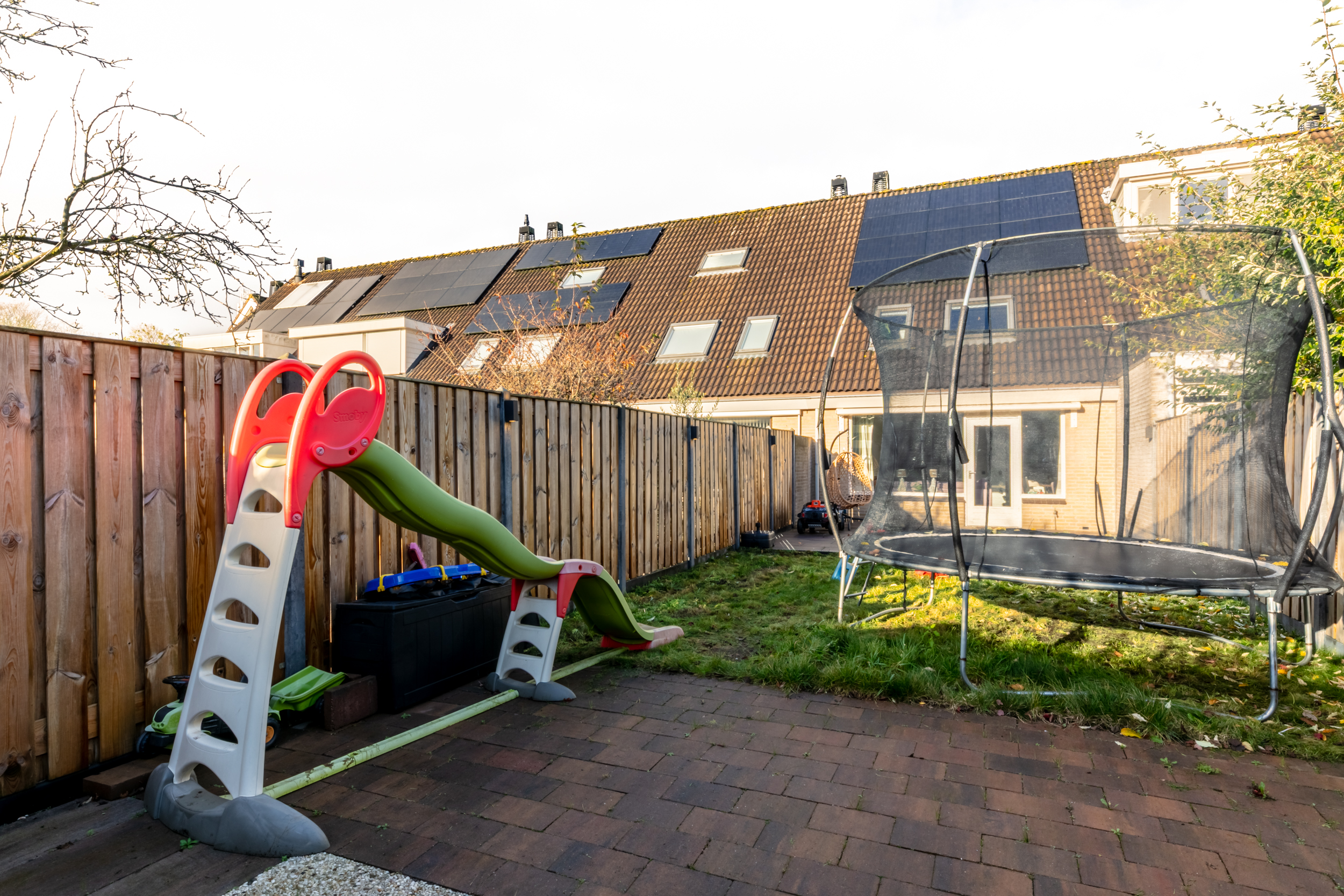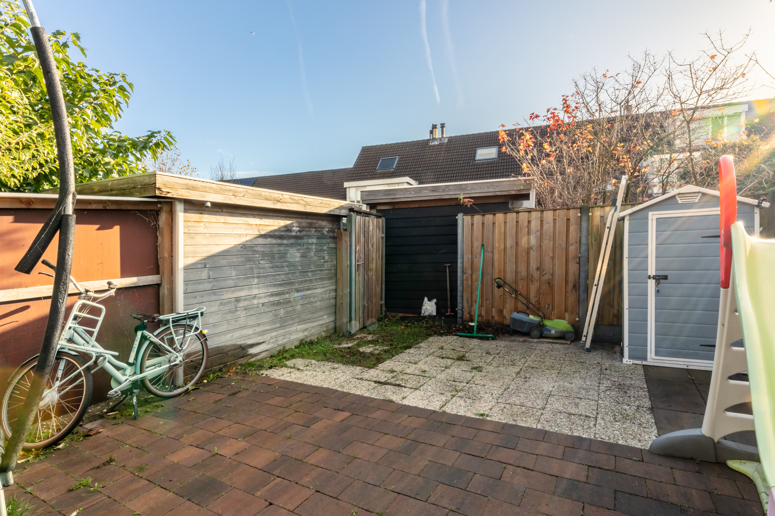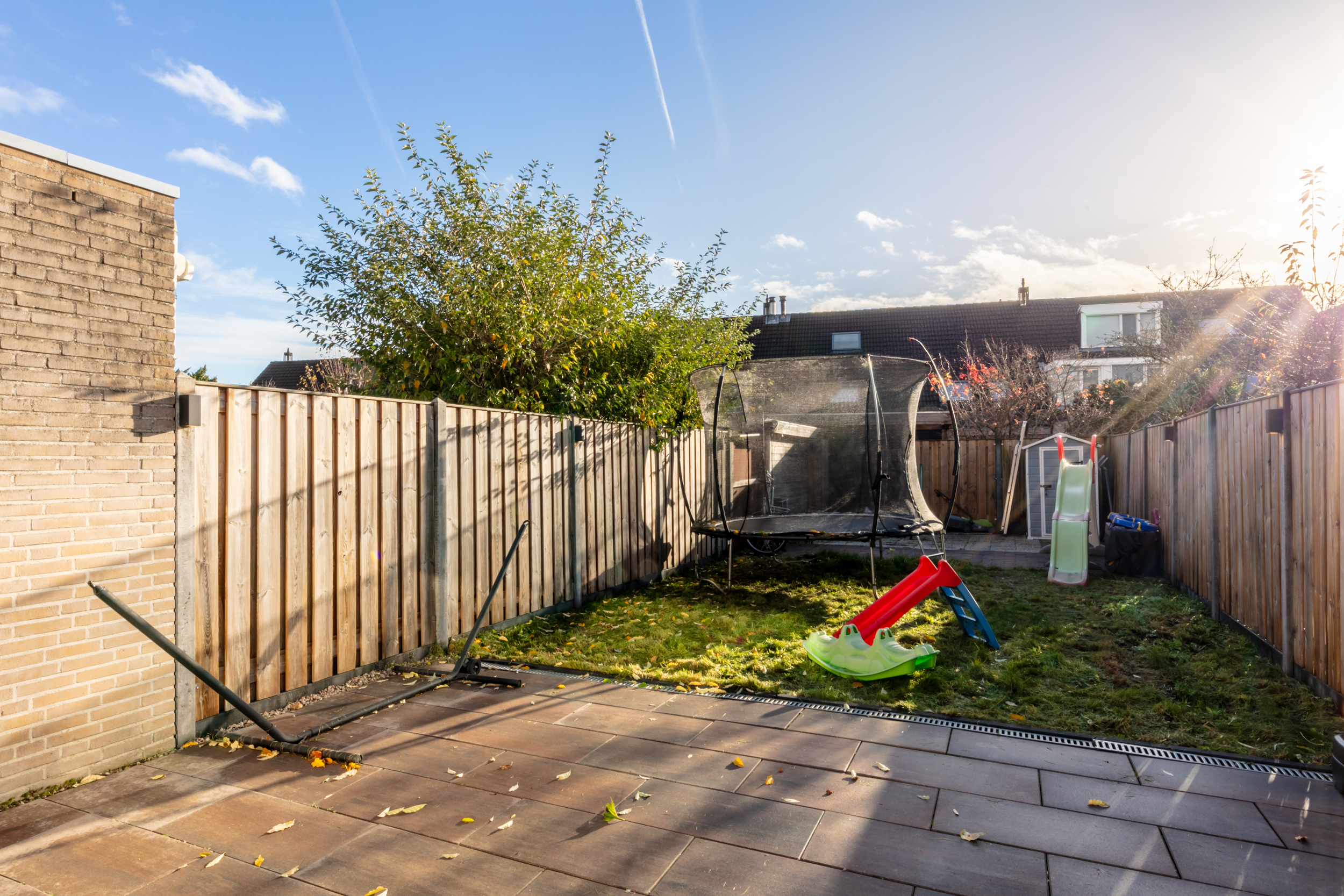 De achtertuin is volledig omheind met een houten erfafscheiding en beschikt links achterin de tuin, over een deur naar het achterpad. Direct aan de achtergevel is een verzorgd stenen terras gerealiseerd, perfect voor een lounge- of eethoek. Daarachter ligt een groen grasveld, ideaal voor spelende kinderen of om heerlijk van de zon te genieten. Dankzij de ligging kunt u hier de hele dag door genieten van zonlicht.