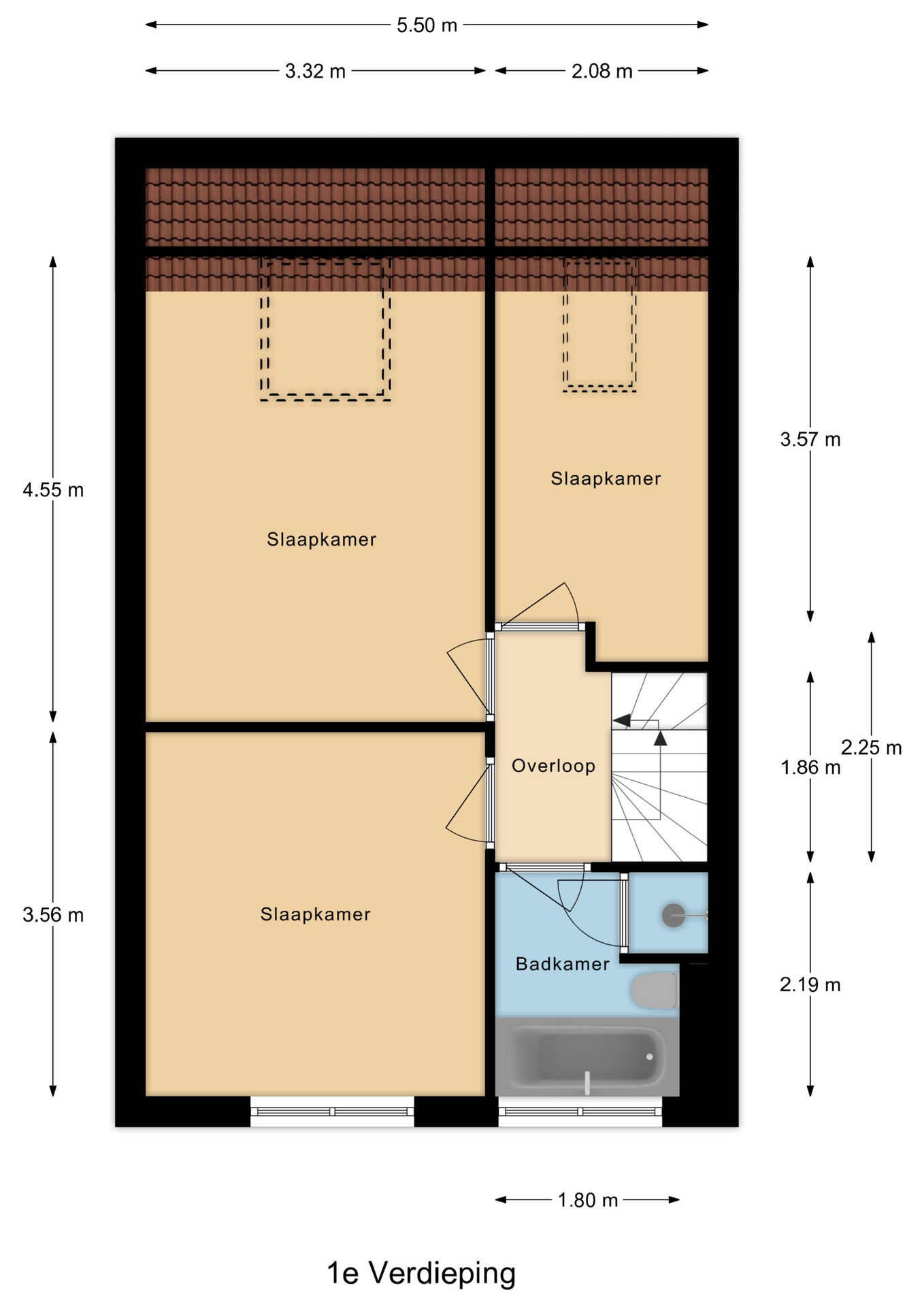 Op de eerste verdieping bevinden zich drie slaapkamers en de badkamer. Aan de voorzijde ligt een ruime slaapkamer, momenteel in gebruik als kinderkamer, maar groot genoeg voor een tweepersoonsbed en extra meubilair.