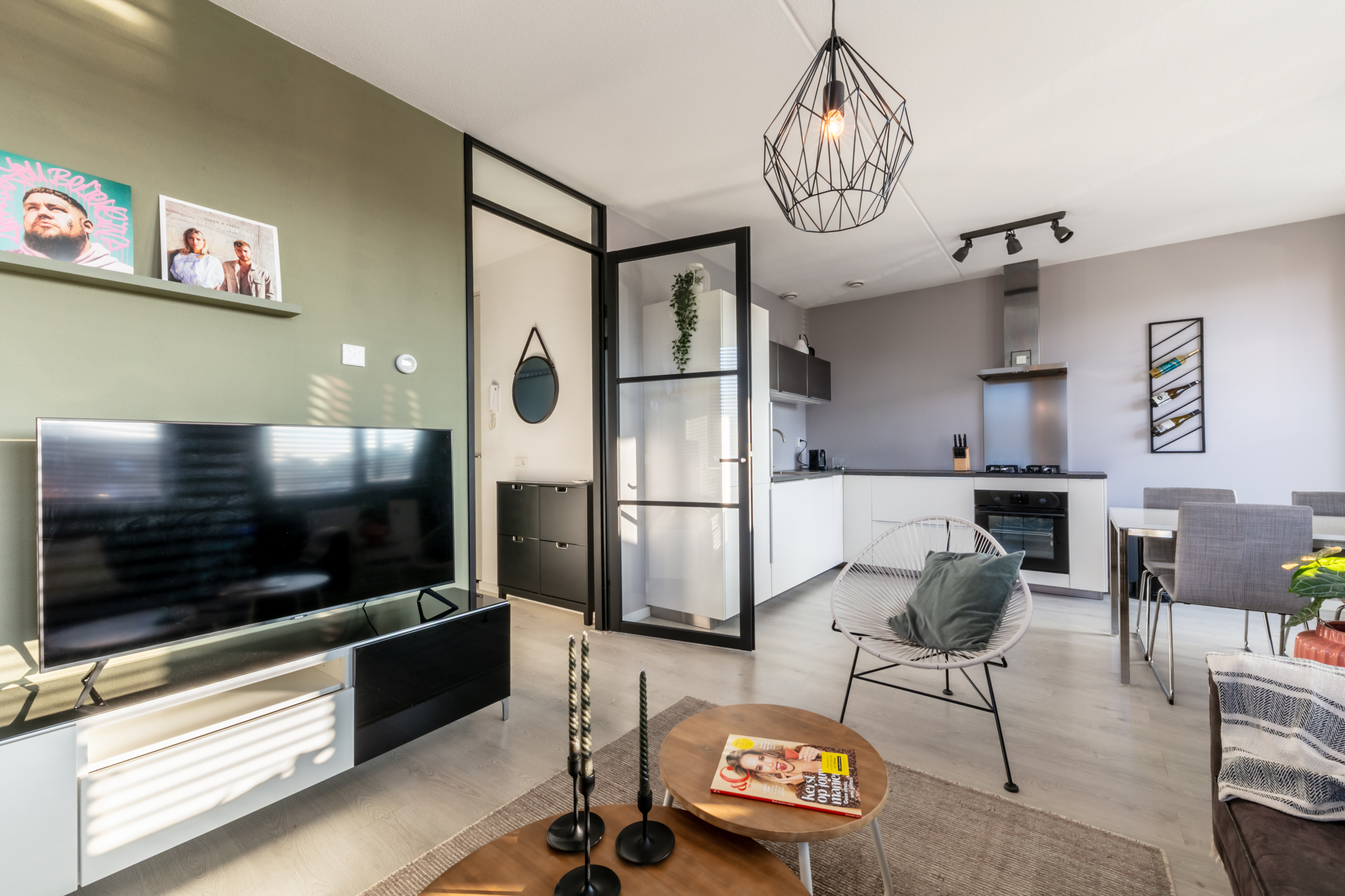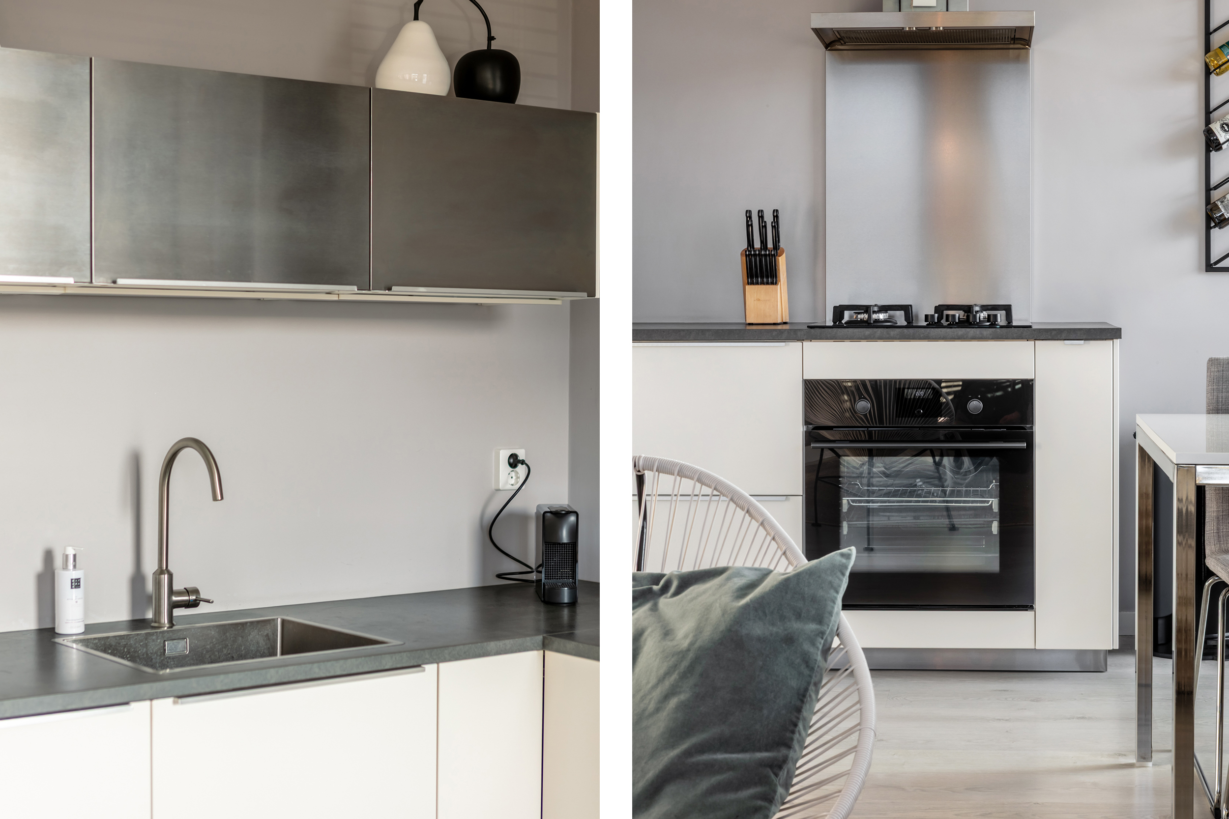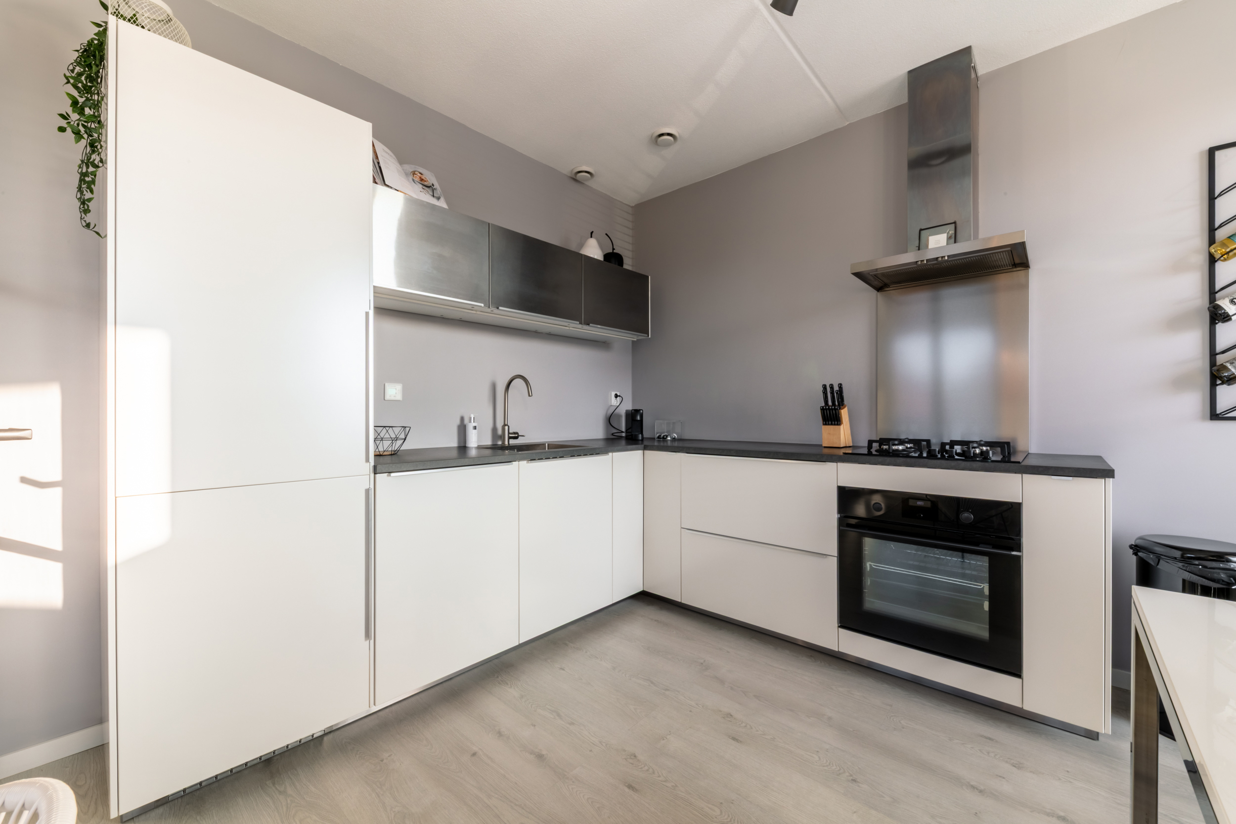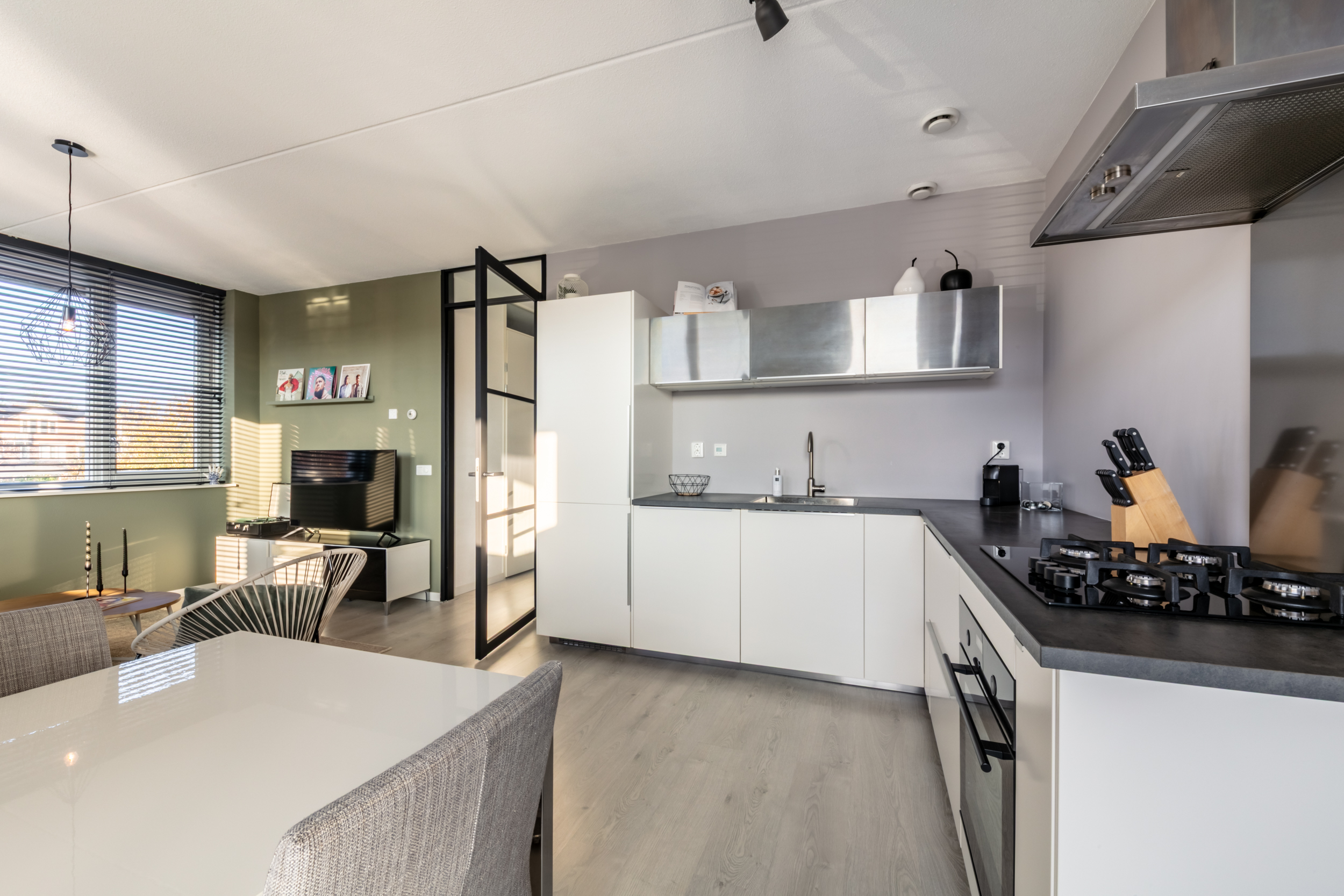 In de woonkamer links is de moderne mat-witte keuken geplaatst in een praktische L-opstelling. Deze is voorzien van een donkergrijs werkblad en alle gewenste inbouwapparatuur: een koel-vriescombinatie, vaatwasser, oven en een 4-pits gasfornuis met afzuigkap. Tegenover de keuken bevindt zich de deur naar het balkon, een heerlijke plek waar u in de zomer vrijwel de hele dag en avond met vrij uitzicht van de zon kunt genieten.