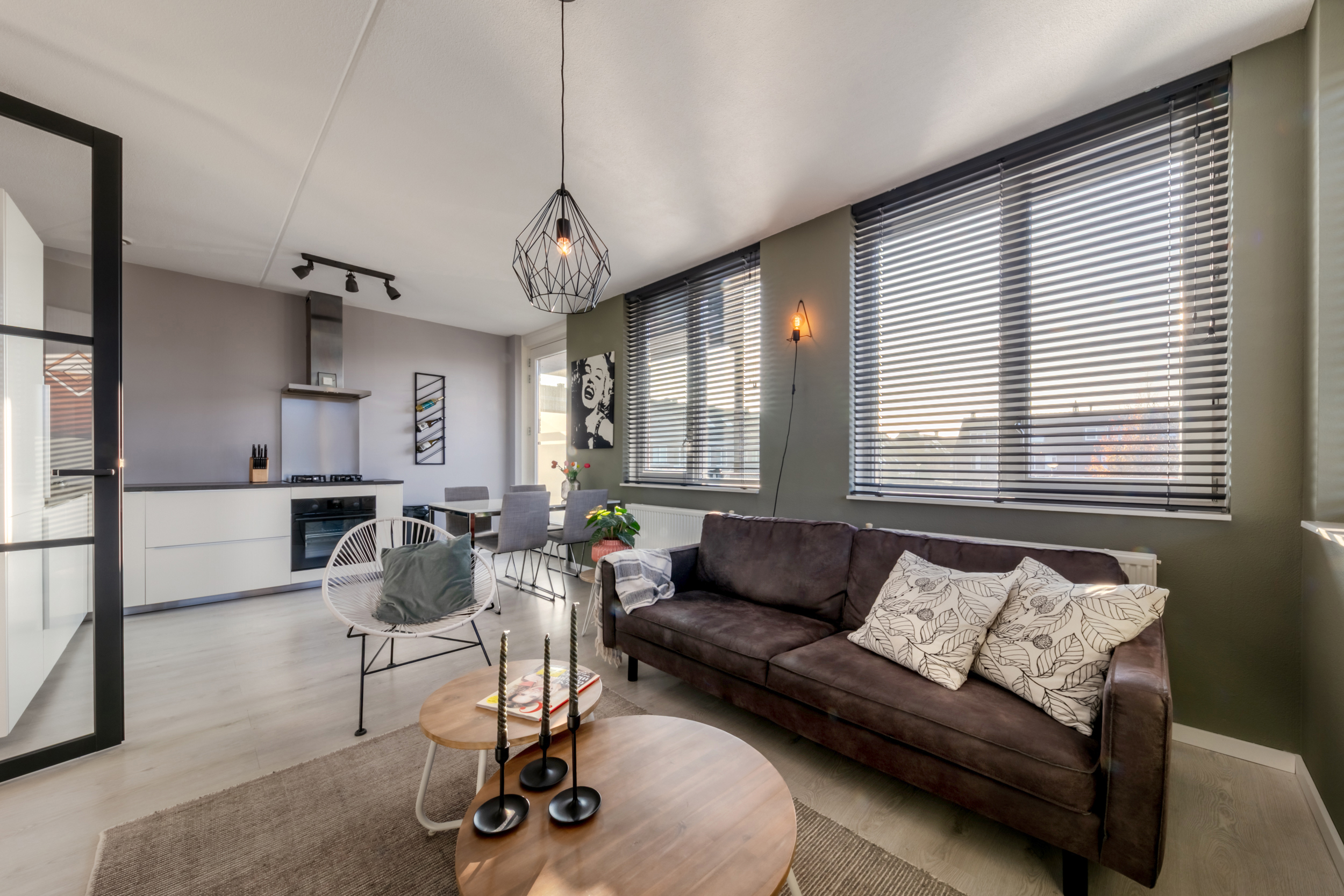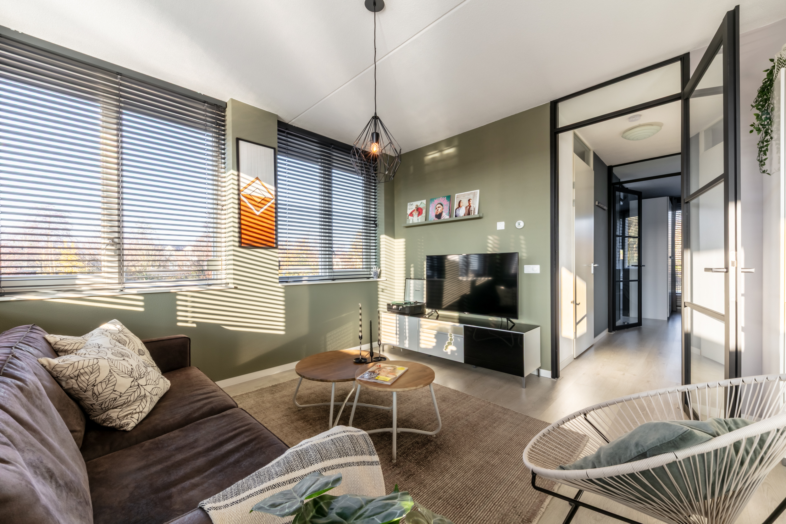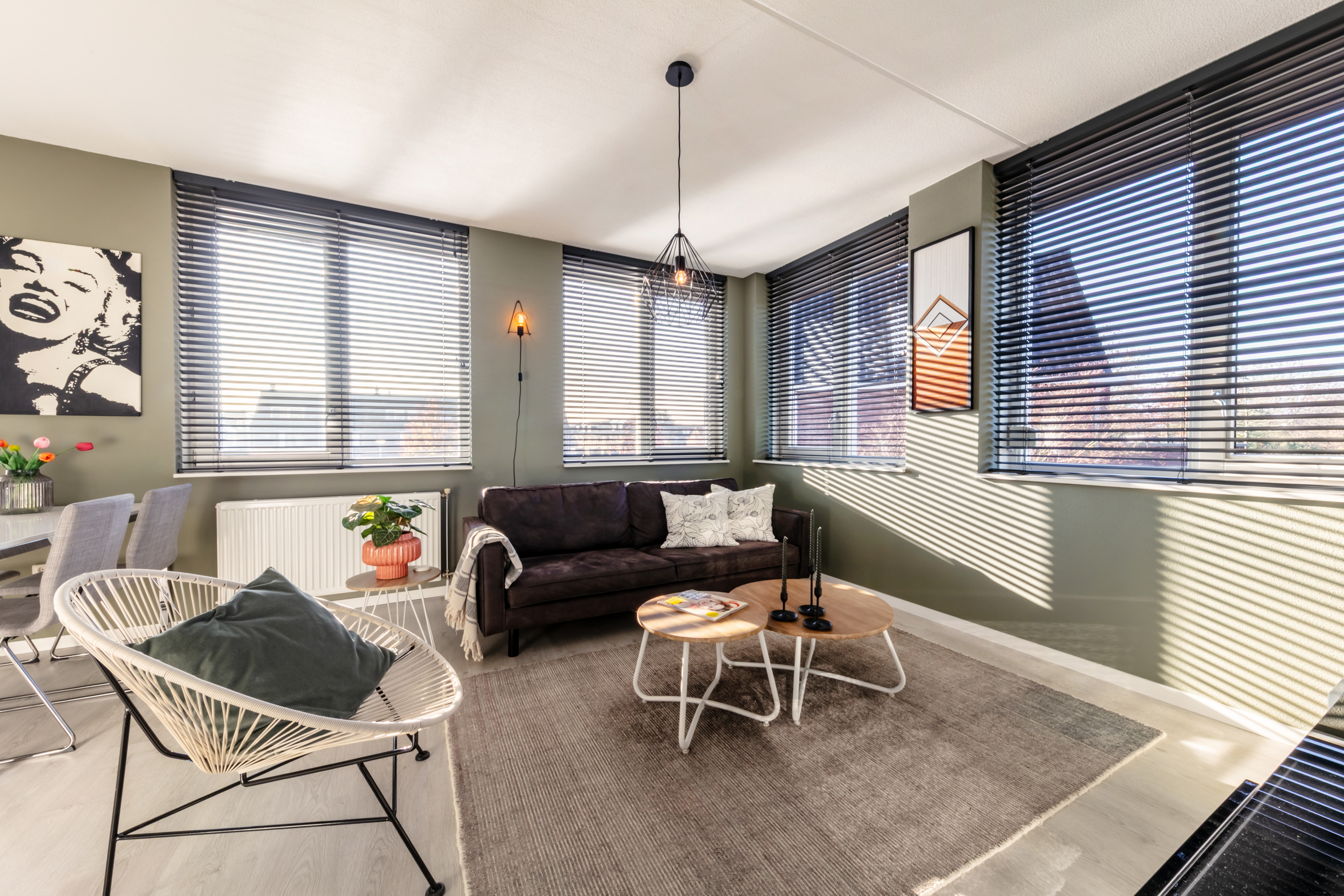 Aan de voorzijde van het appartement treft u de lichte en sfeervolle woonkamer. Dankzij de extra zijramen geniet u hier van een prettige hoeveelheid daglicht. De ramen aan de zijkant van het complex zijn voorzien van zonnescreens, zodat u ook op warme dagen een aangenaam binnenklimaat behoudt.
