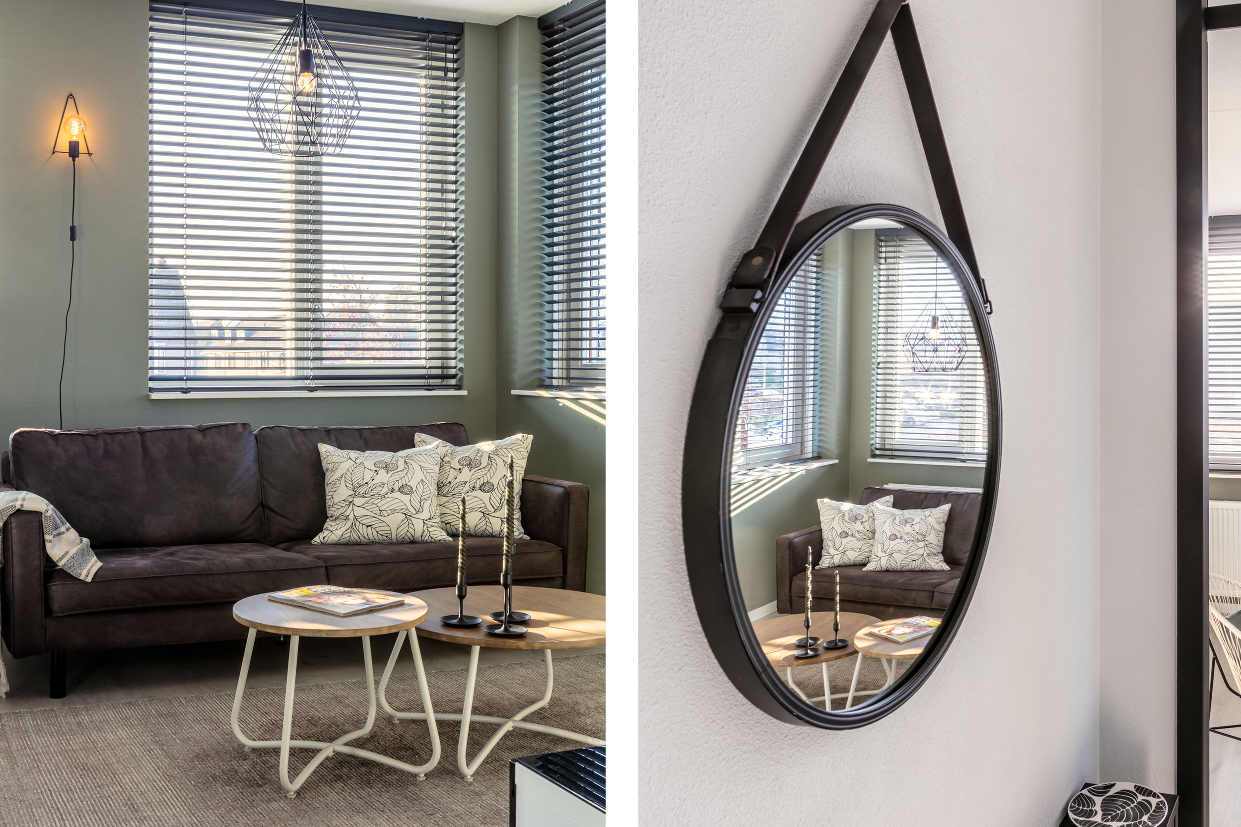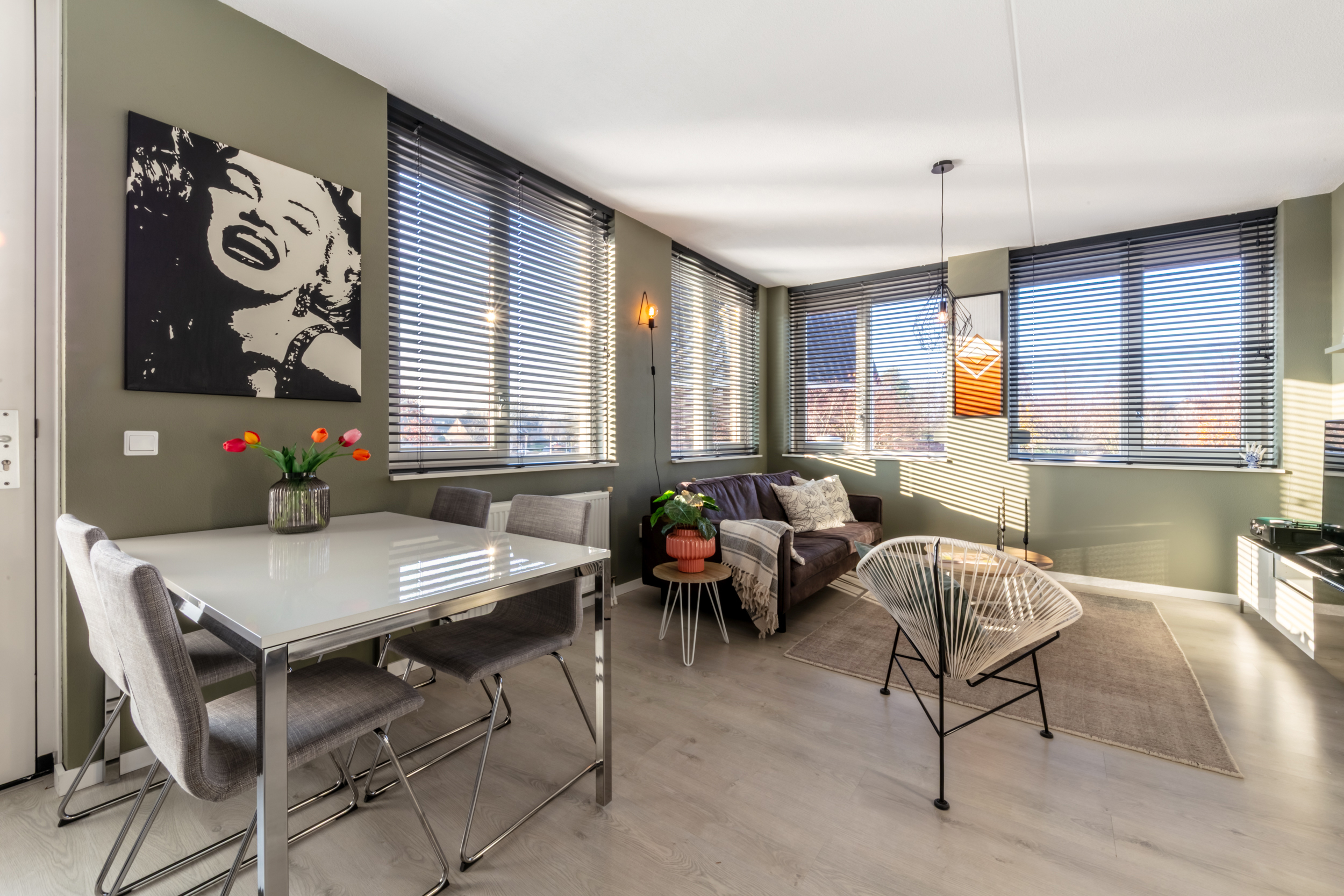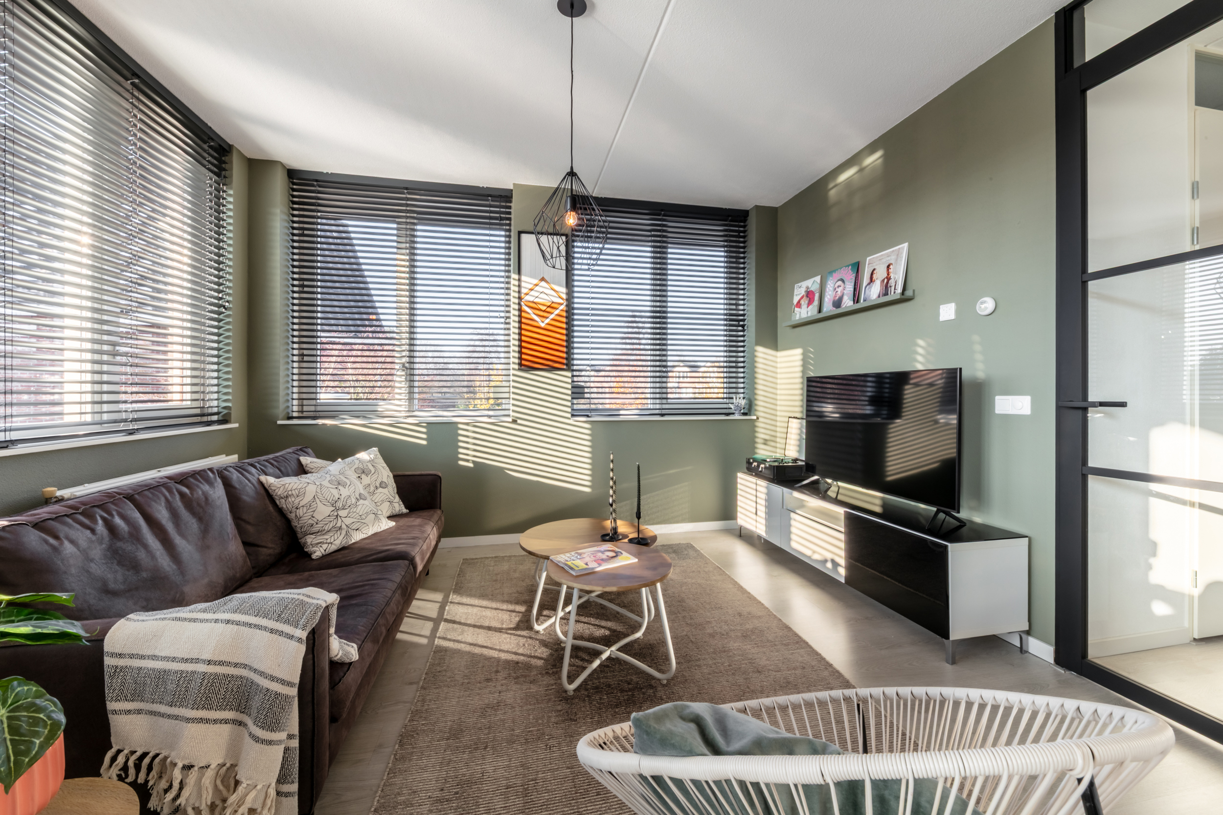 Aan de voorzijde van het appartement treft u de lichte en sfeervolle woonkamer. Dankzij de extra zijramen geniet u hier van een prettige hoeveelheid daglicht. De ramen aan de zijkant van het complex zijn voorzien van zonnescreens, zodat u ook op warme dagen een aangenaam binnenklimaat behoudt.