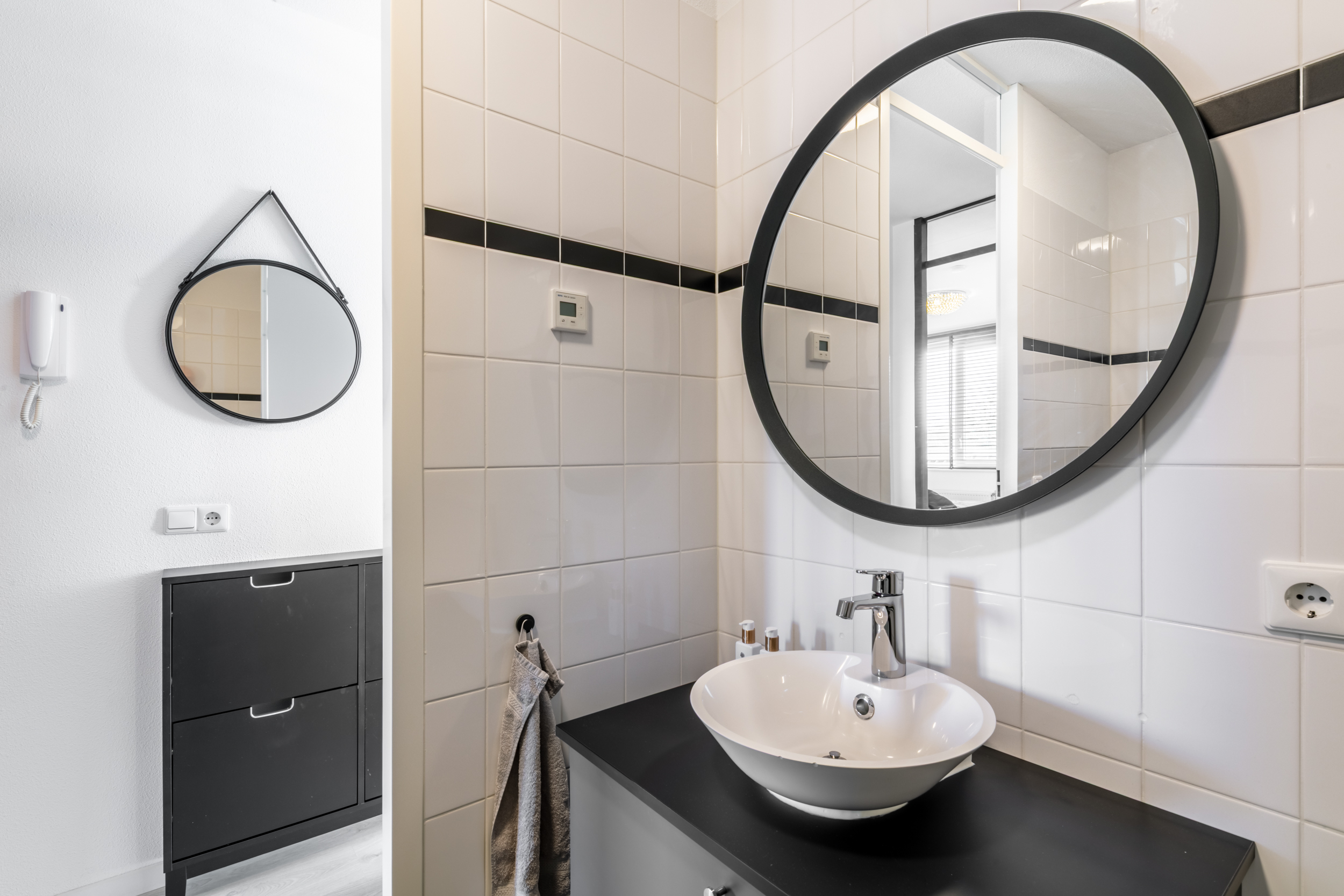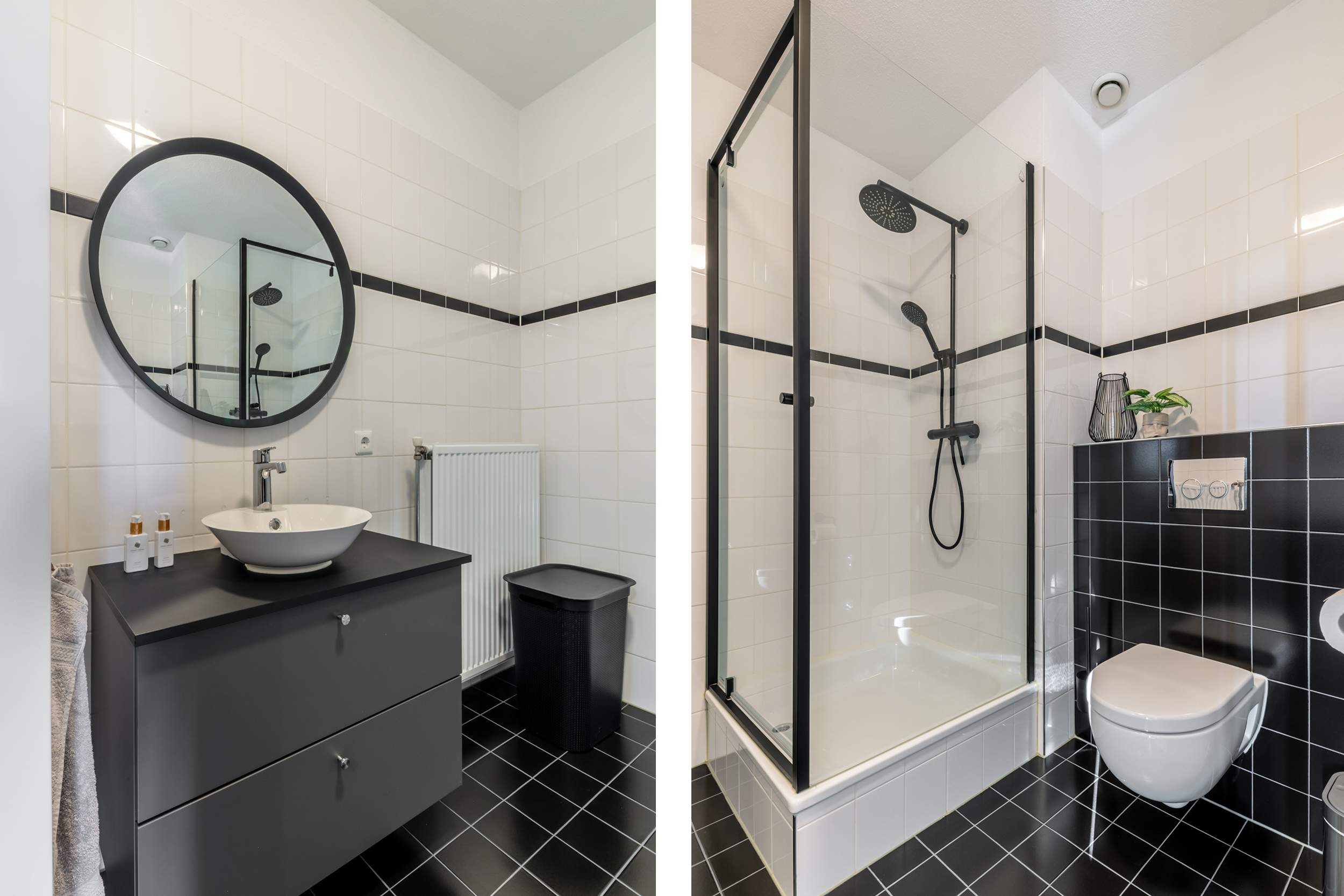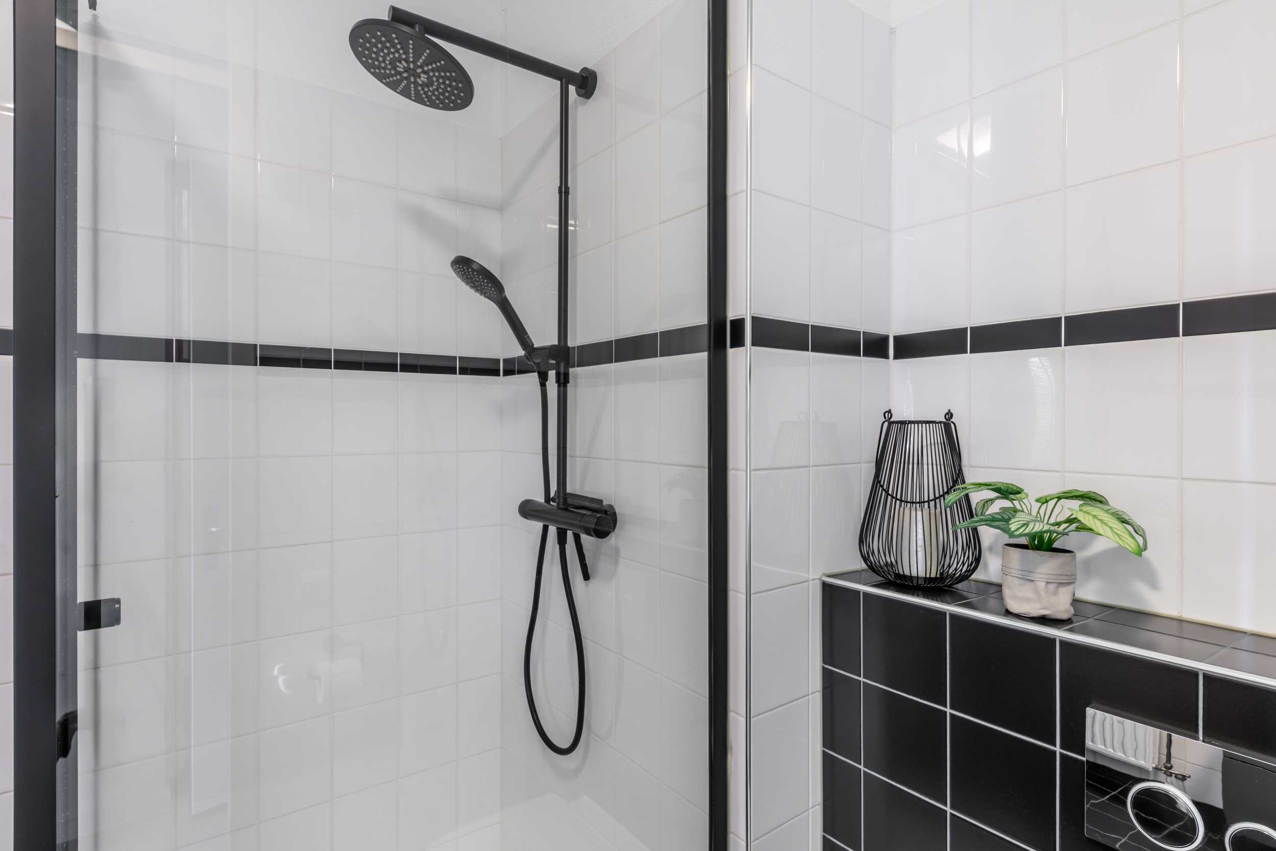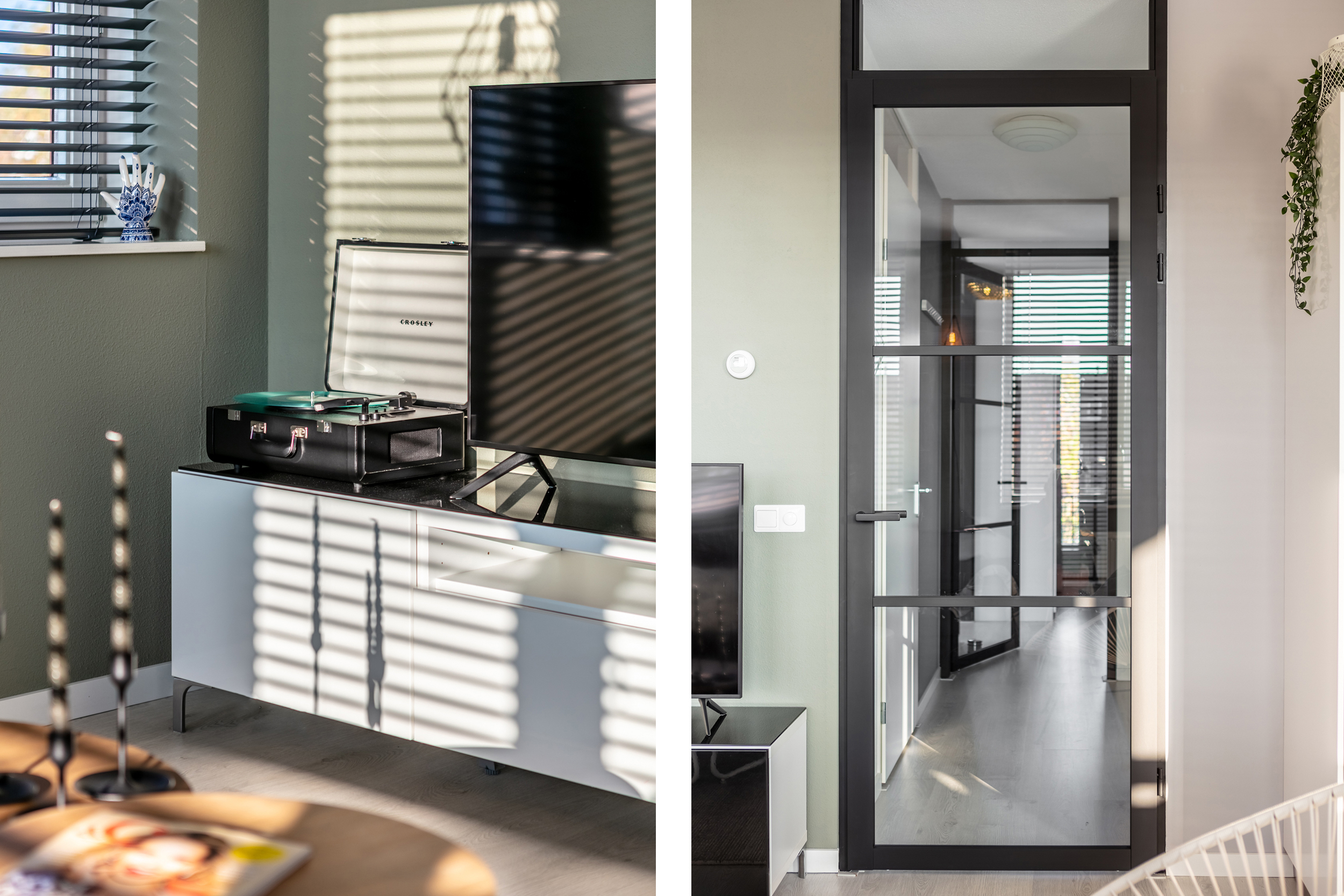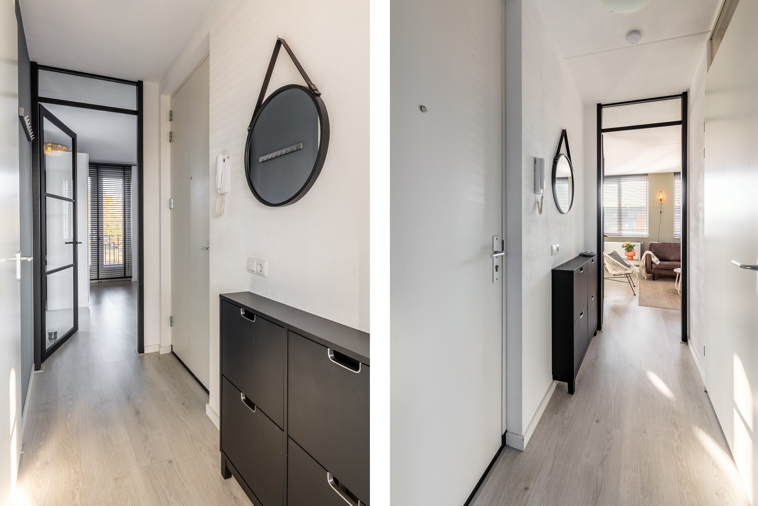 Zodra u de voordeur opent, stapt u binnen in de hal die zich te midden van de woning bevindt. Vanuit deze ruimte heeft u direct toegang tot diverse vertrekken, waaronder de badkamer die zich recht tegenover de voordeur bevindt. Zowel de deur naar de woonkamer als die naar de slaapkamer zijn Industriële deuren met veel glas en geven hierdoor een open gevoel.