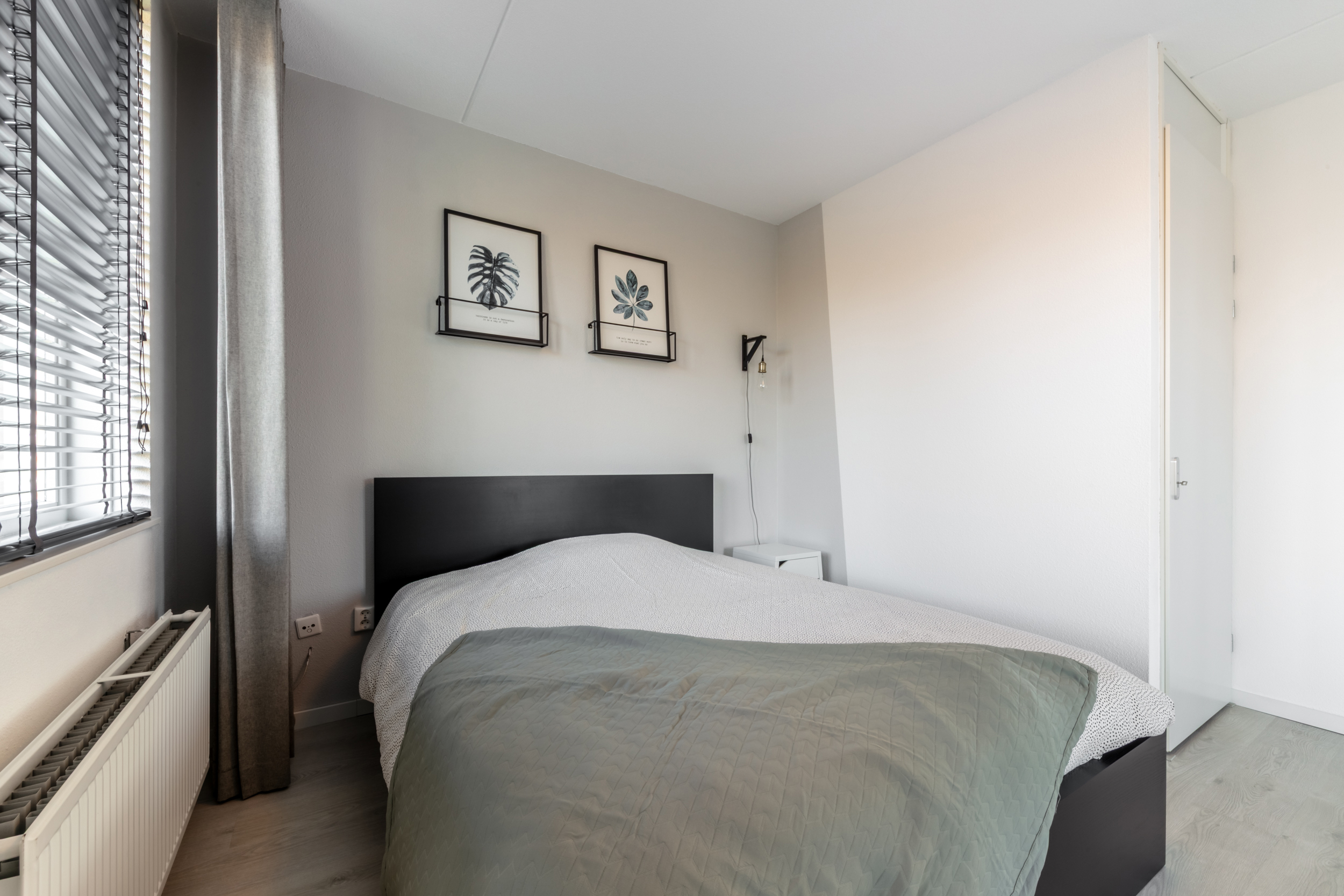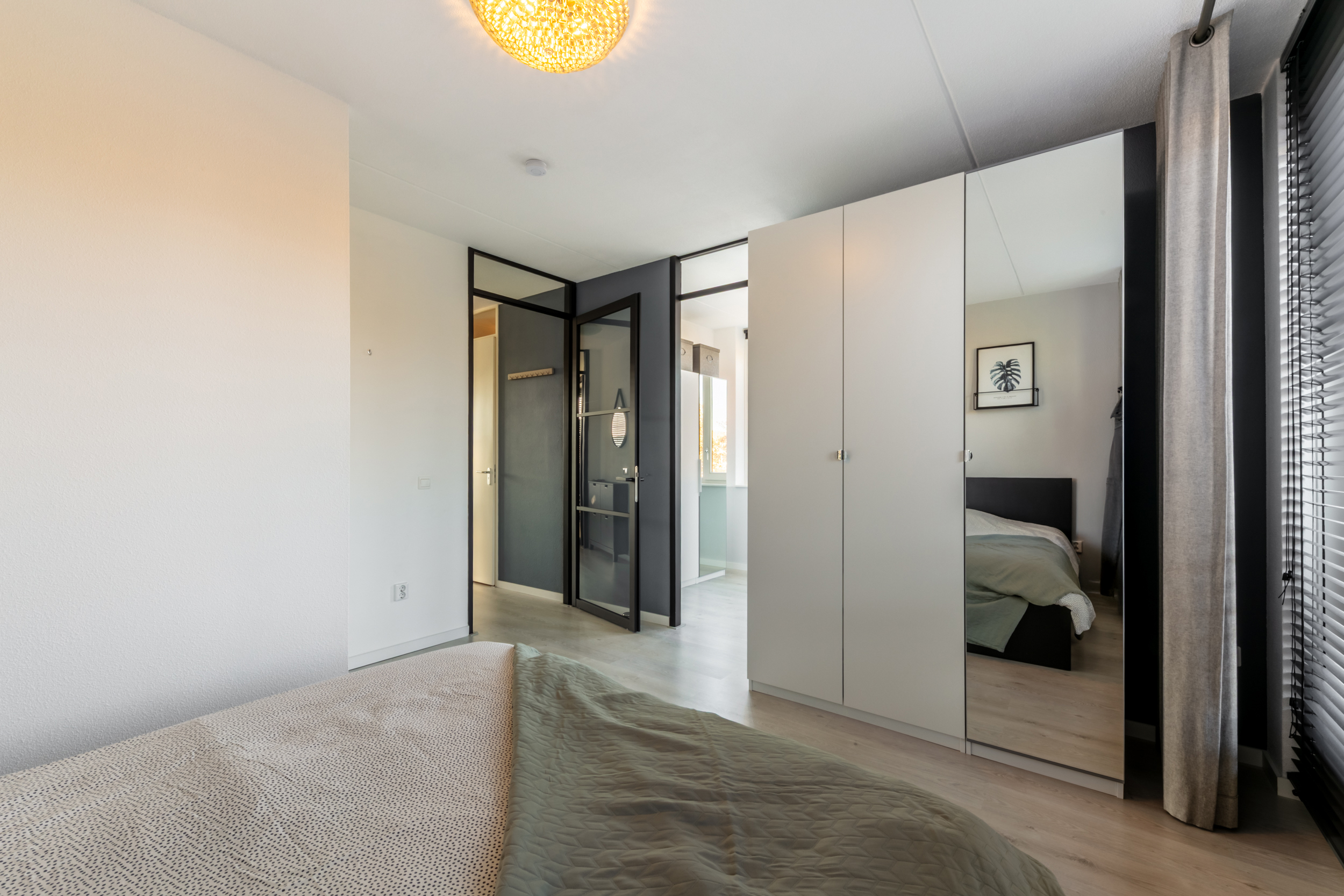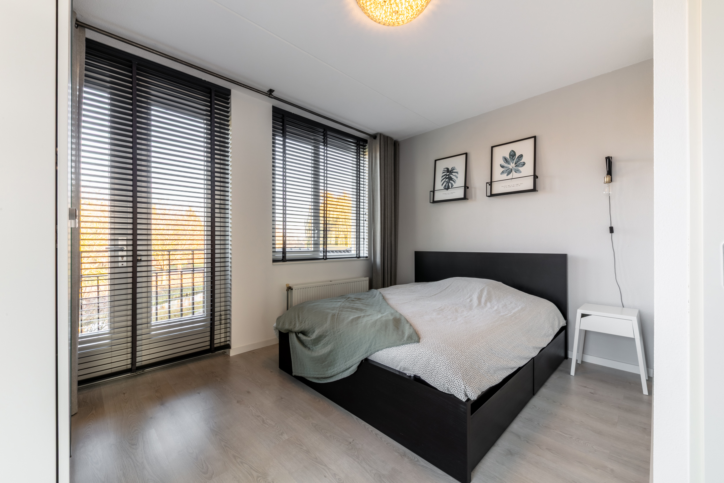 De grootste slaapkamer beschikt over één groot raam en twee openslaande deuren met frans balkon en uitzicht op het park achter het complex. De kamer biedt voldoende ruimte voor een tweepersoonsbed en een kledingkast. Bij binnenkomst in de slaapkamer bevindt zich aan de rechterzijde een aparte ruimte met de cv-installatie en de aansluiting voor de wasmachine.
