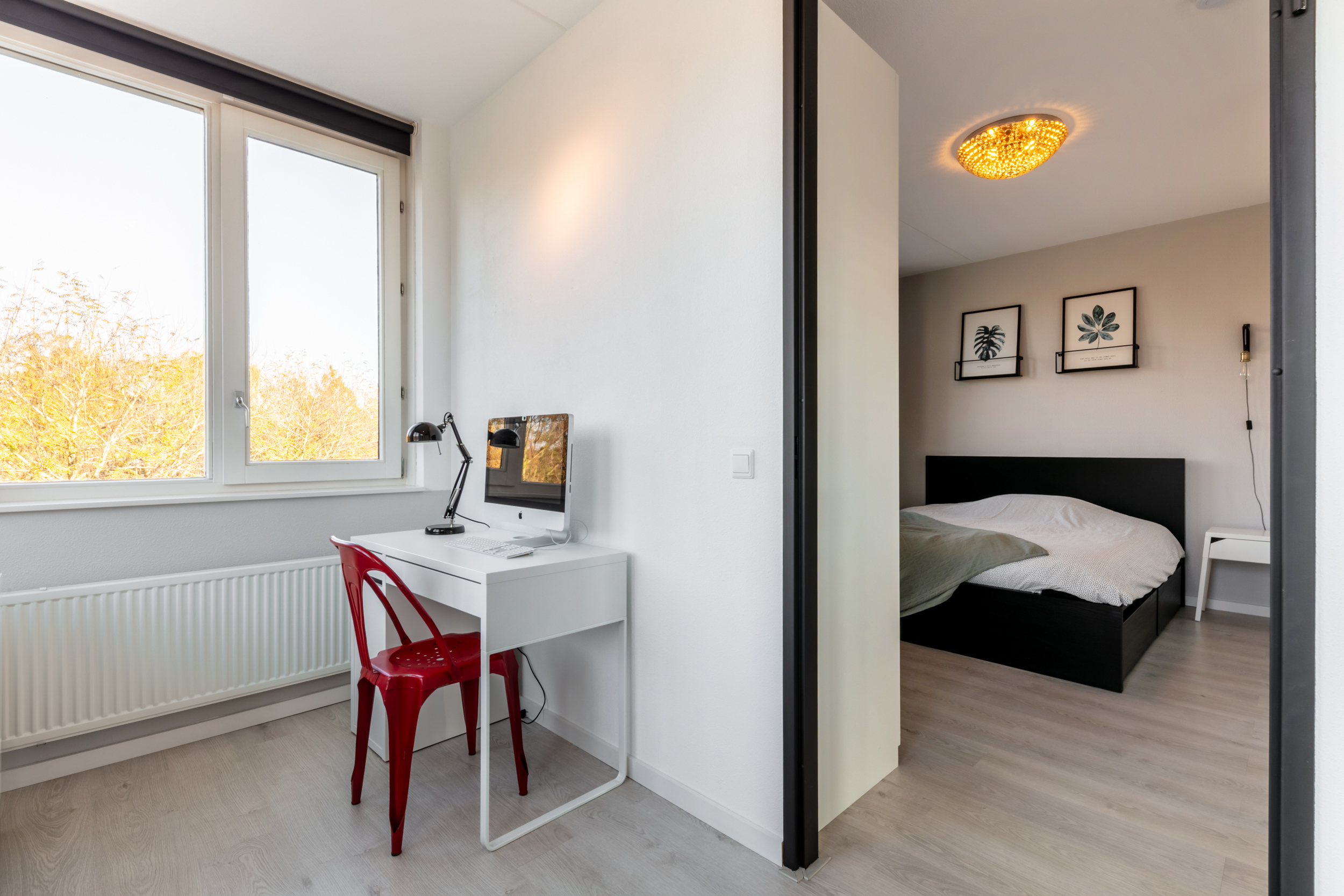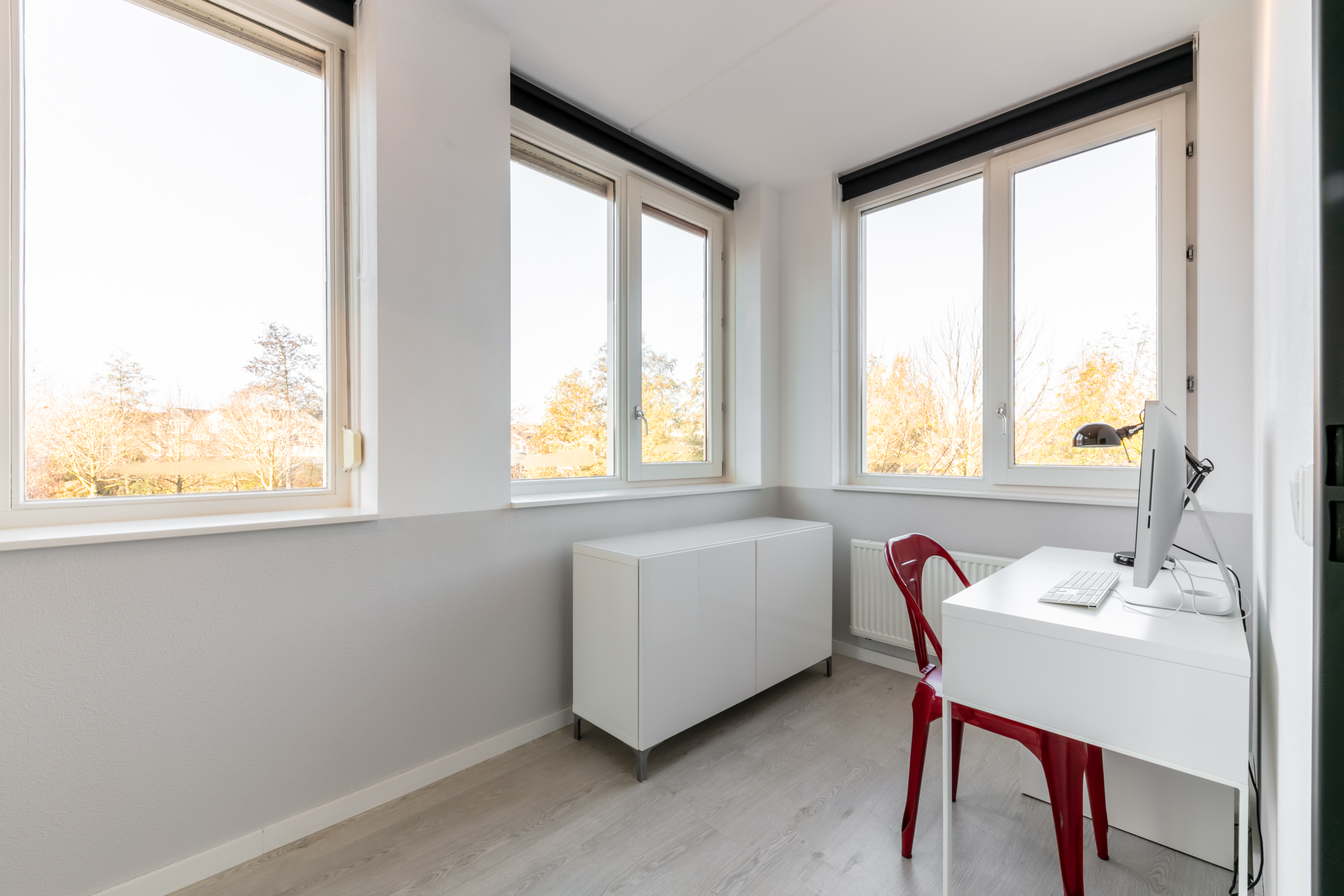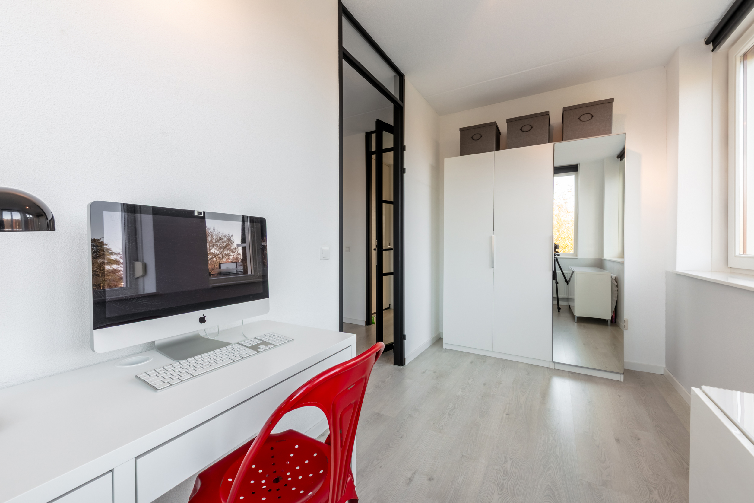 Vanuit de slaapkamer loopt u door naar de tweede, kleinere slaapkamer. Deze kamer leent zich uitstekend als werk-, studeer- of kinderkamer. De tweede slaapkamer beschikt over twee grote zijramen én een extra raam aan de achterzijde, waardoor ook hier een prettige lichtinval aanwezig is.