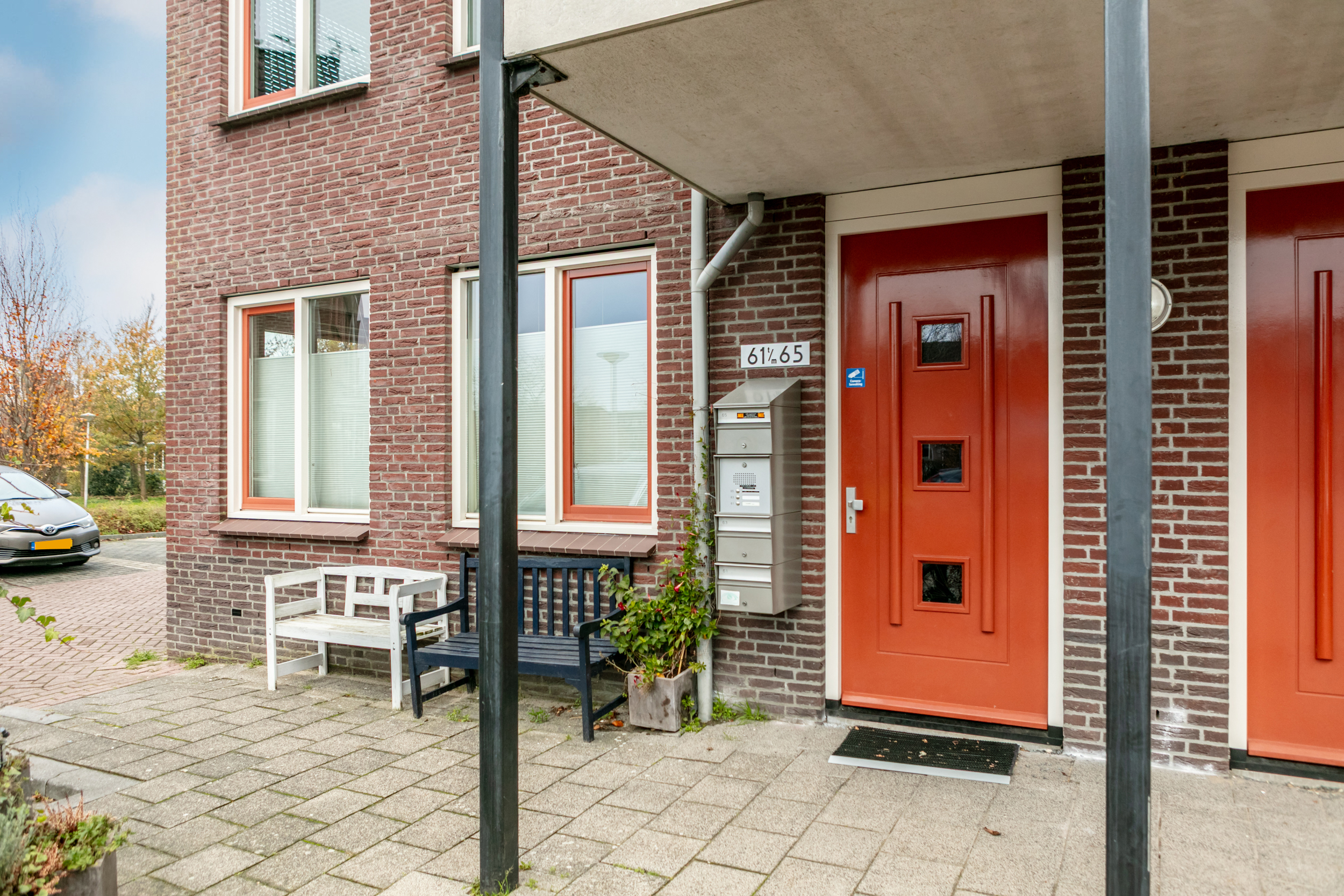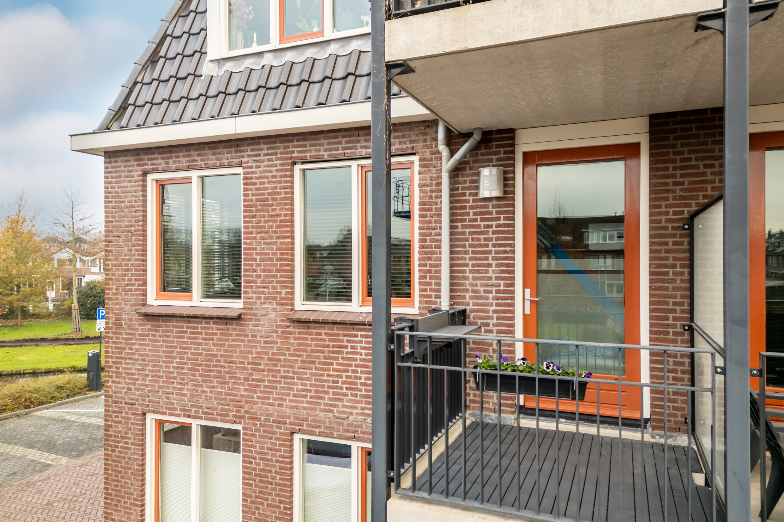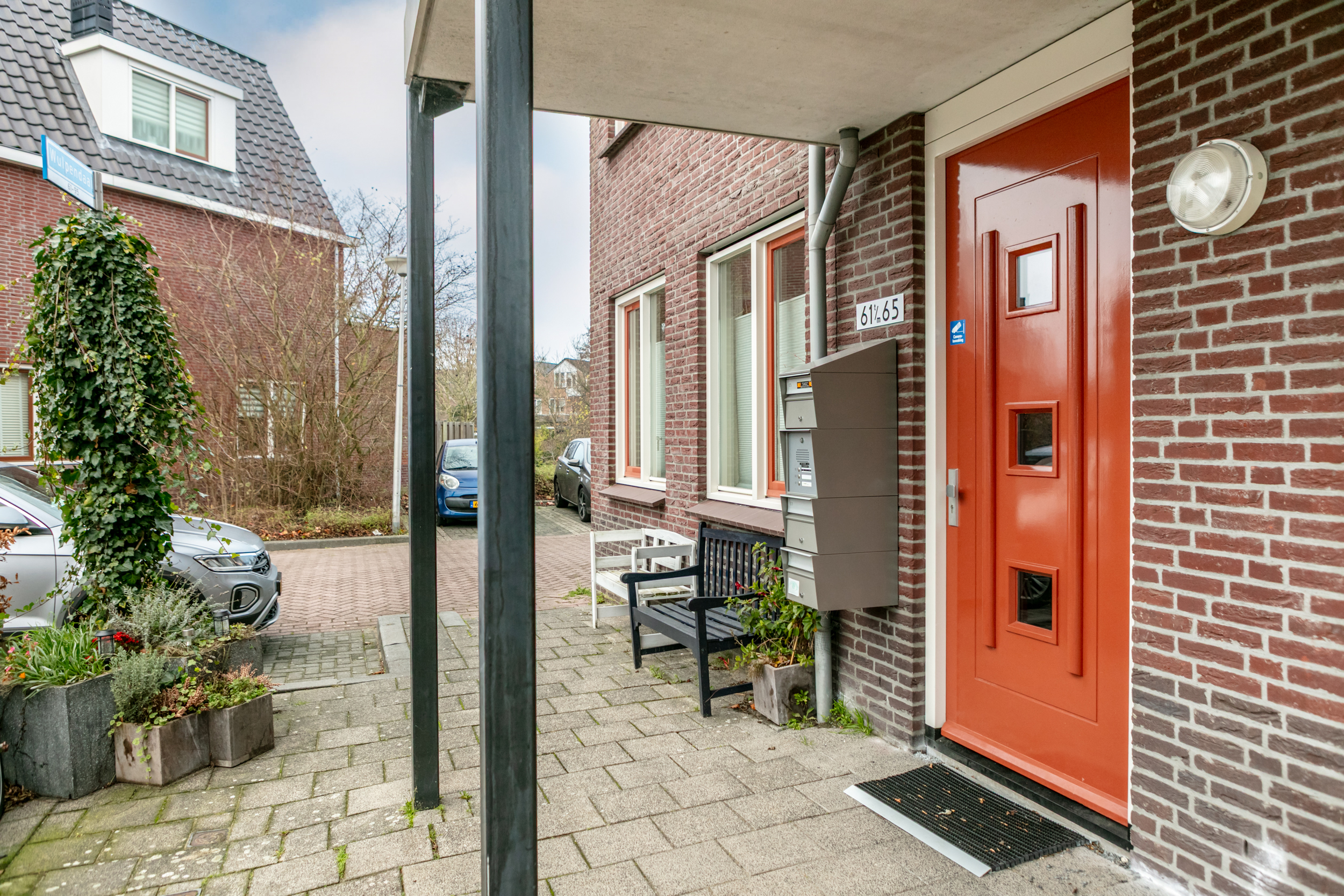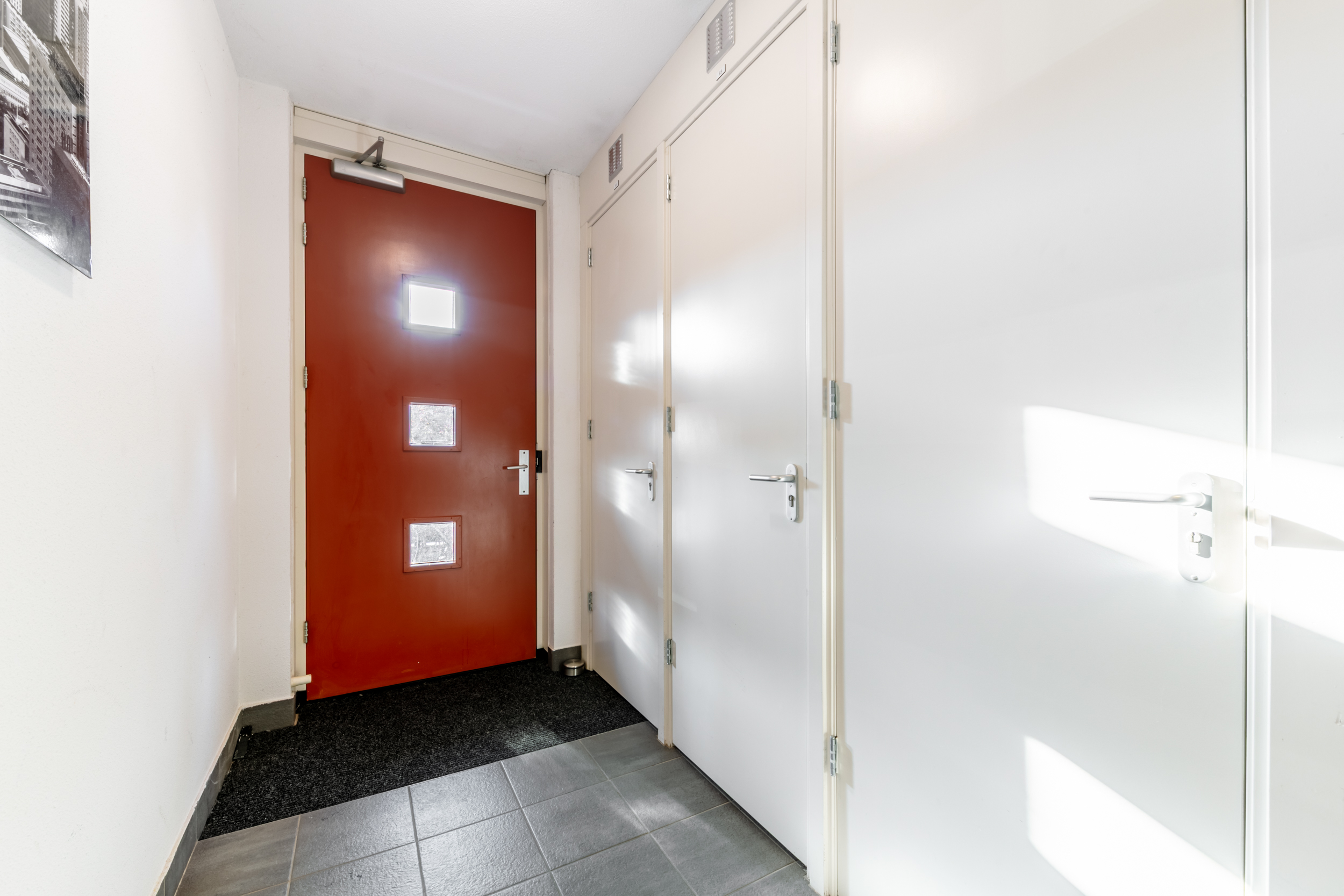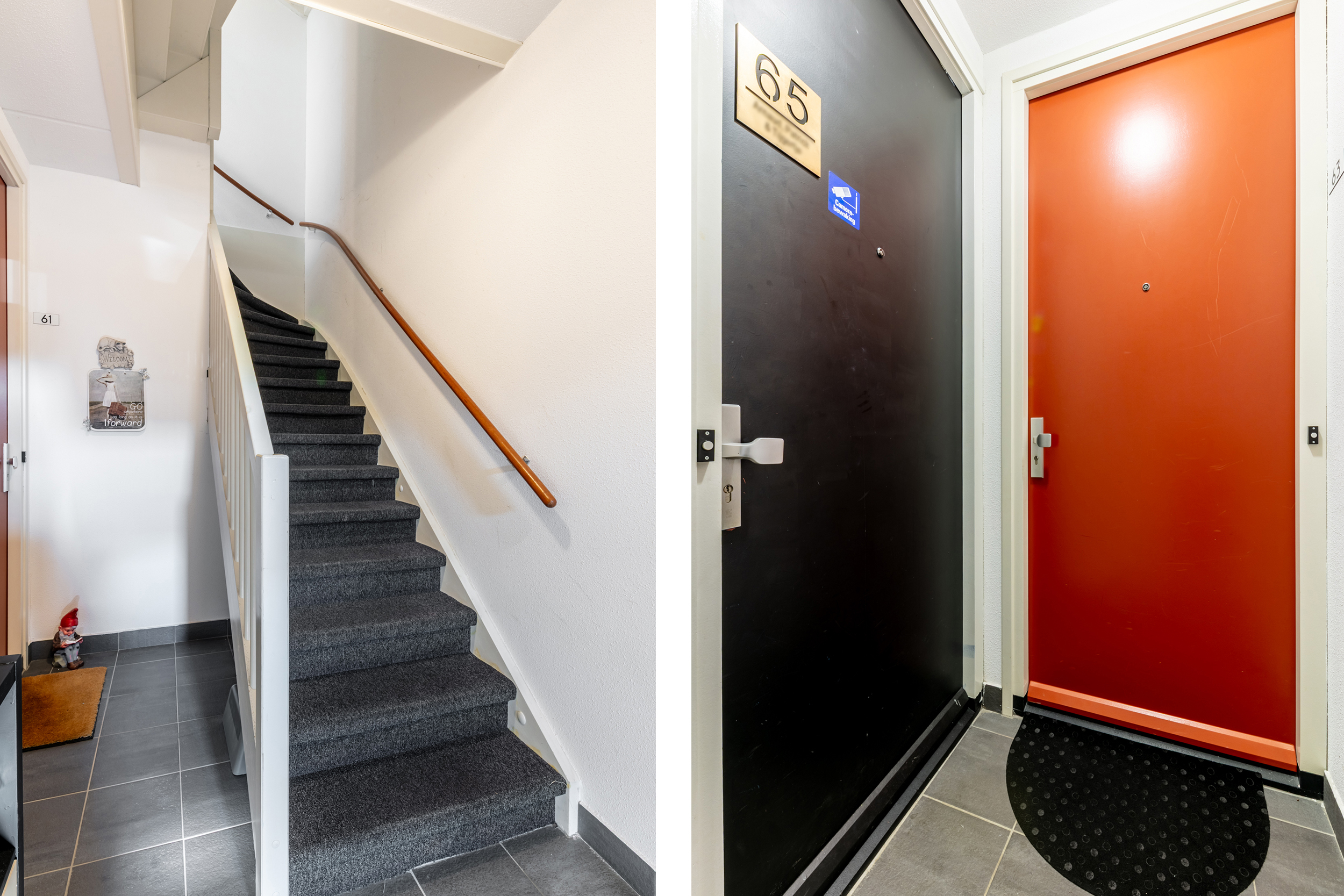 Wanneer u aankomt bij het complex vindt u de gezamenlijke entree buiten, voorzien van de brievenbussen en intercominstallatie. Deze entree wordt slechts gedeeld met twee andere appartementen, wat zorgt voor rust en privacy. Via de trap bereikt u de eerste verdieping, waar de voordeur van dit appartement én die van het bovenliggende appartement zich bevinden.